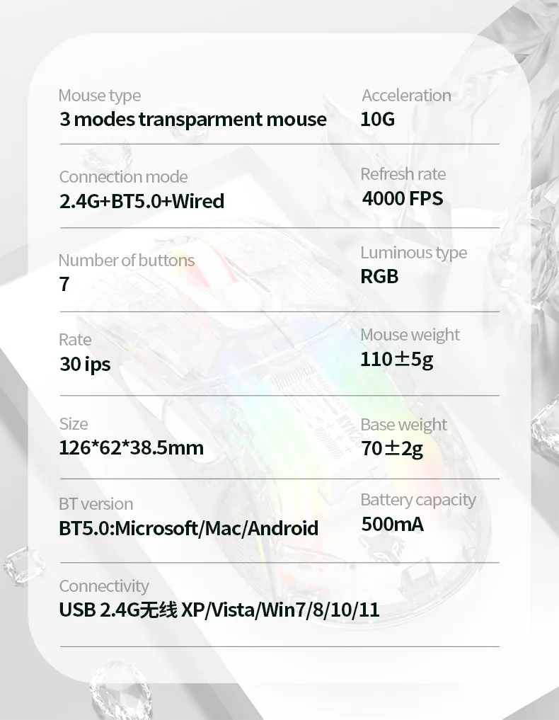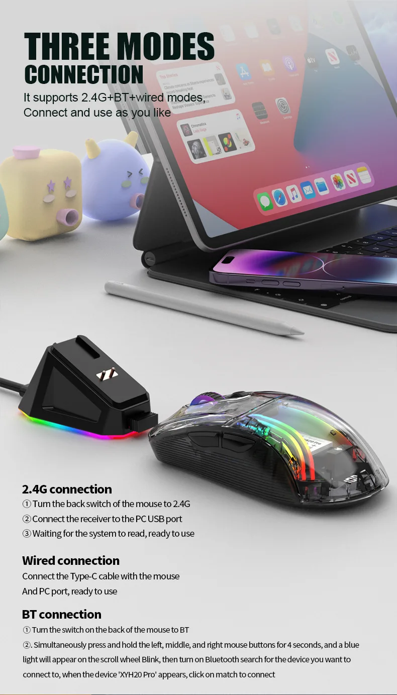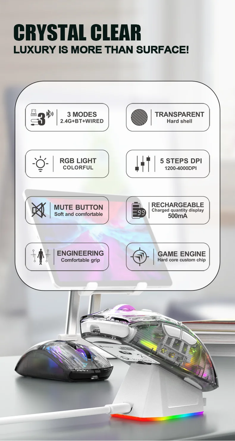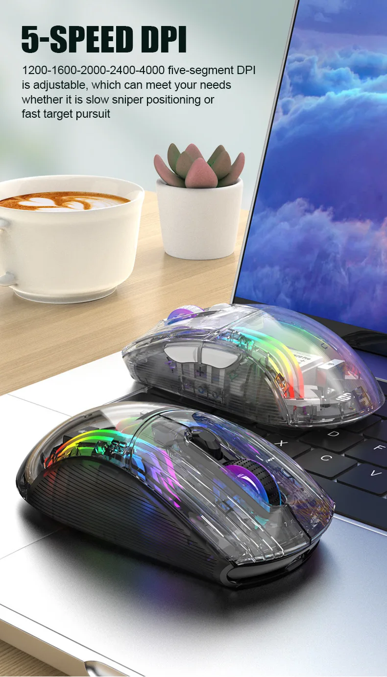 Comprar JUMPEAK Ratón Transparente RGB Gaming Bluetooth Inalámbrico Con Cable 3 Modos Pantalla Digital Type-C Recargable Mudo Ordenador PC jugador ratones