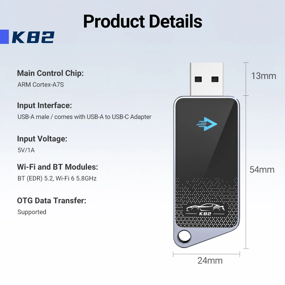 Comprar K82 nuevo adaptador inalámbrico CarPlay compatible con Plug And Play WiFi6 BT5.2 conexión automática Universal para Nissan Toyota Mazda Camry Suzuki
