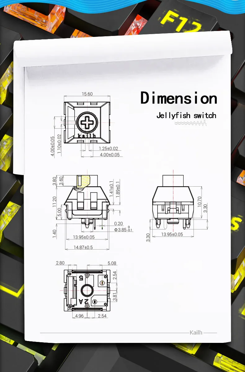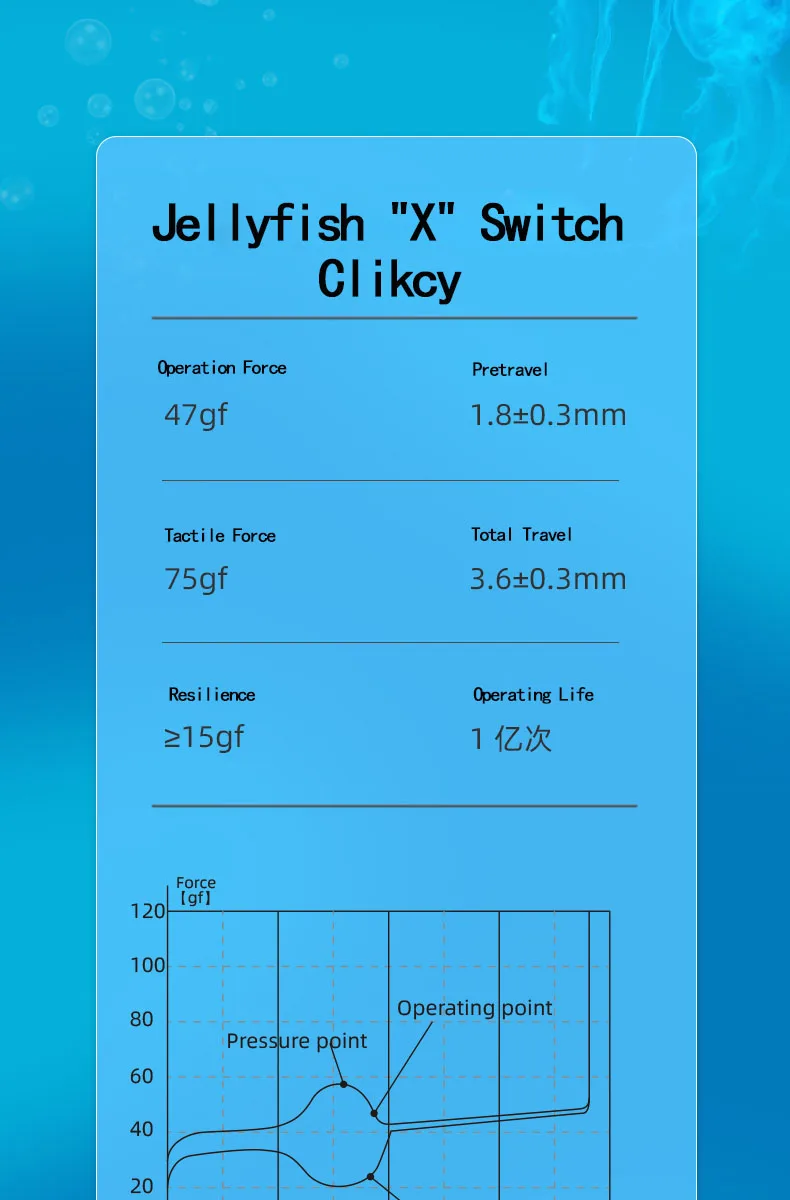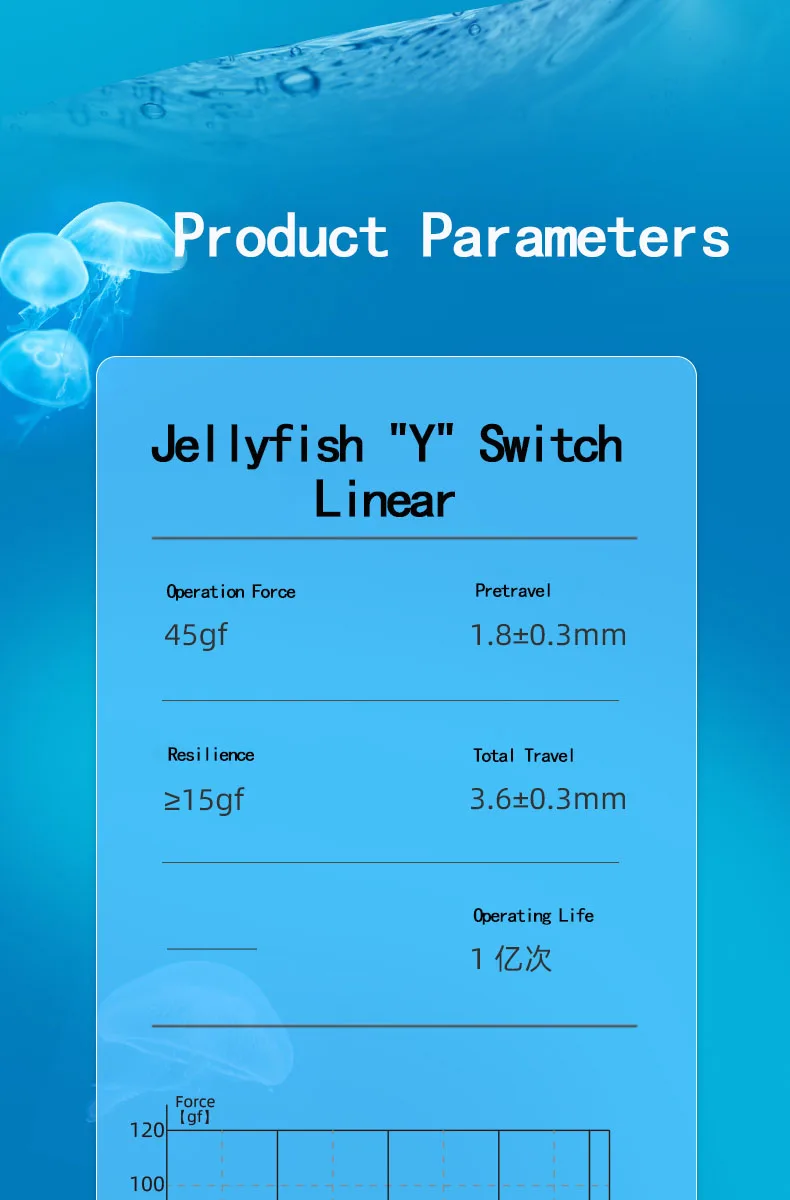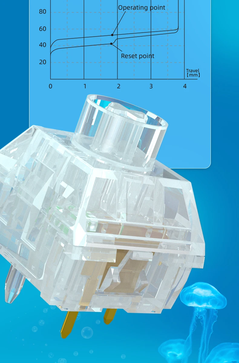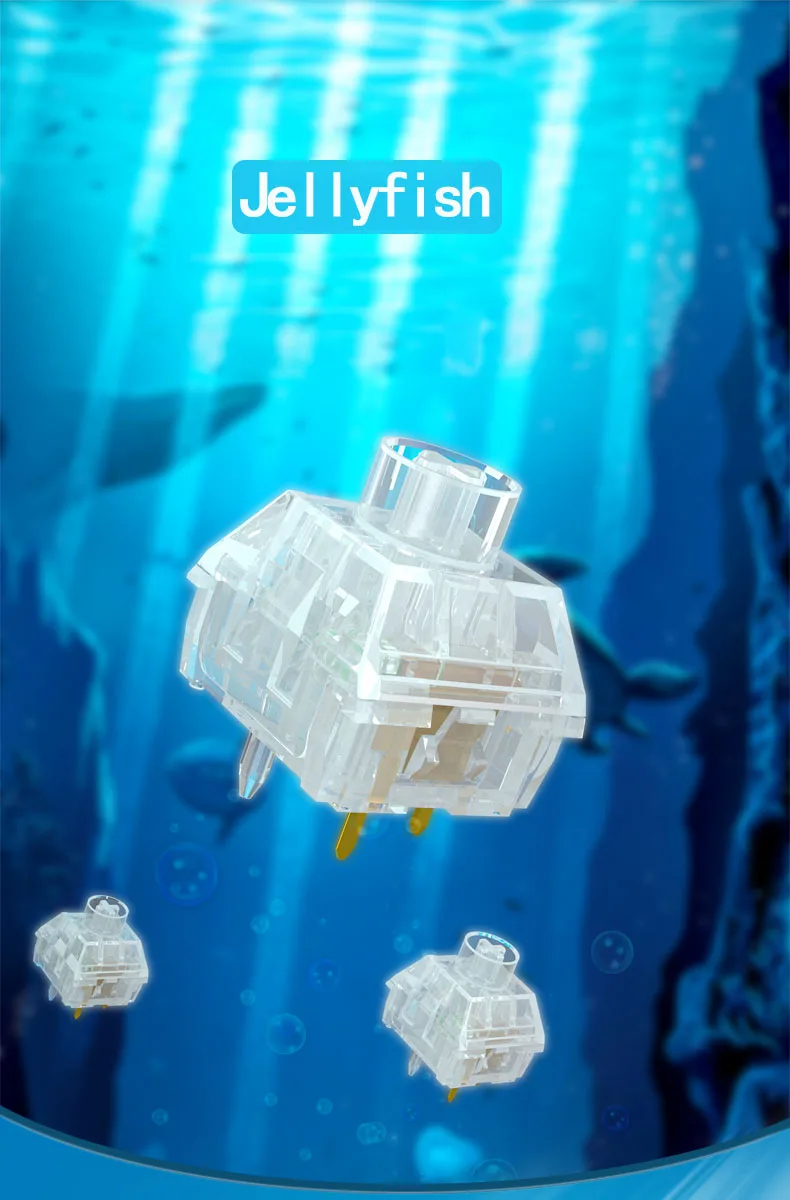 Con el liderazgo en el rendimiento del interruptor lineal, el interruptor Kailh Jellyfish tiene muchos de los beneficios de su nombre, casi sin ningún inconveniente. Parte de Kailh's Box and Master Series, la medusa cuenta con carcasas de policarbonato duraderas, un vástago de poliamida de alto peso molecular y una estructura exclusiva de Master-Series para mejorar la vida útil. Y con herrajes chapados en oro resistentes a la corrosión, es todo más frágil. Con un funcionamiento moderado de 50 gramos de fuerza, dispone de 4 milímetros de recorrido total. Además, está prelubricado de fábrica, por lo que se necesita cada pulsación como un pez (gelatina) para regar. Además de su su suavidad lineal, un tallo y carcasas transparentes aumentan similitudes a las medusas. Ideales para exhibir iluminación RGB, estos componentes transparentes también revelan el resorte chapado en oro, que mide 18 milímetros de largo para minimizar el ruido y maximizar el rebote.