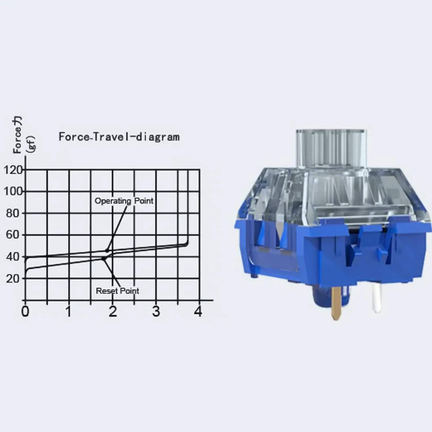 Fuerza operativa: 45 ± 10 gf, Fuerza táctica: 60 ± 10 gf, Viaje: 2,0 ± 0,4 mm, Viaje total: 3,6 ± 0,4 gf, Vida mecánica: 100 millones de veces