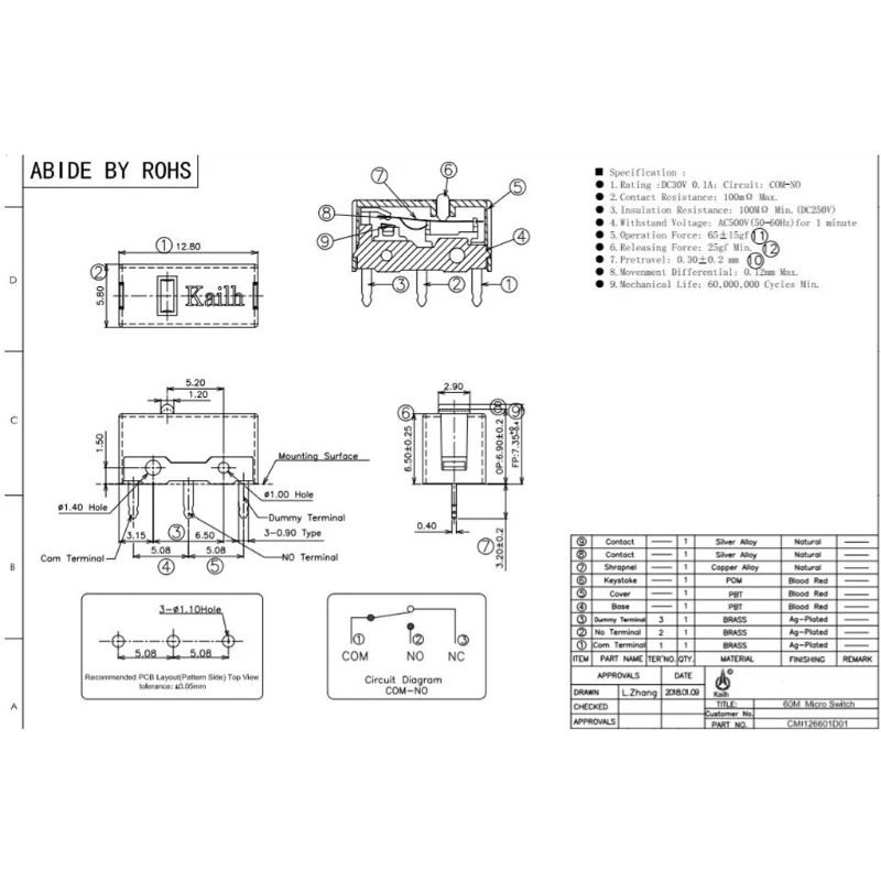 Valor CR (velocidad de toque Manual): El valor CR es un valor de parámetro que mide la sensación de un botón desde el movimiento y la velocidad. Su fórmula de cálculo es CR=(OF-CF)/De, (presión de funcionamiento de la fuerza de operación, presión de disparo de fuerza de contacto CF), según la investigación, una sensación del micro interruptor fino,. Su rango de valor CR se controlará en 15% -35%, y el microinterruptor Kaihua GM, a través de la mejora y prueba continuas, Y finalmente estabiliza el valor CR de aproximadamente 25%. El mango es nítido, la fuerza de rebote es uniforme y no hay histéresis.