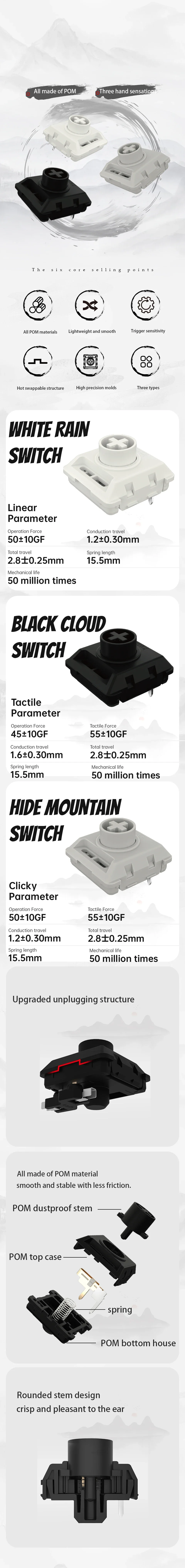 Impresionantes interruptores táctiles de perfil bajo. Una advertencia: como los interruptores Kailh Black Cloud no tienen superficies reflectantes o transparentes, la luz de los LED RGB montados en la PCB es escasa. Necesitarás subir el brillo para poder ver los LED debajo de las teclas con esos interruptores. La entrega fue rápida. ¡Proveedor y producto recomendados!