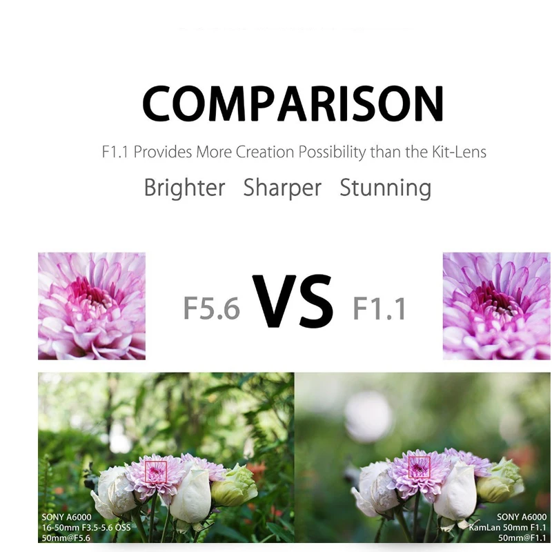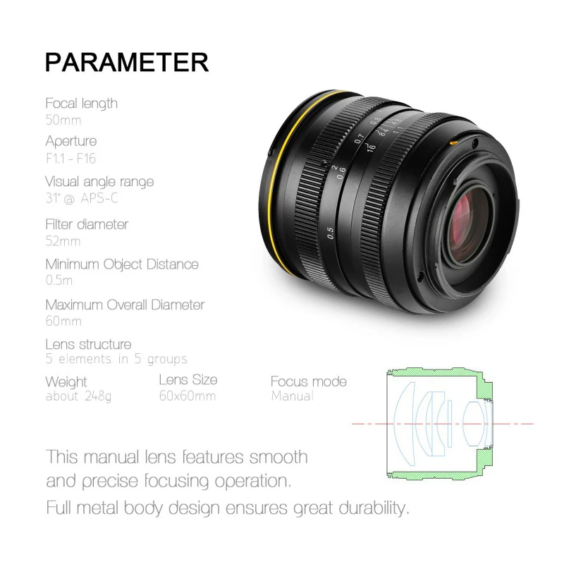 1. Diseño revestido de vidrio óptico multicapa, cuerpo exquisito con impresionante apertura máxima F1.1, creando un encantador efecto de desenfoque de fondo y una calidad de imagen más clara.