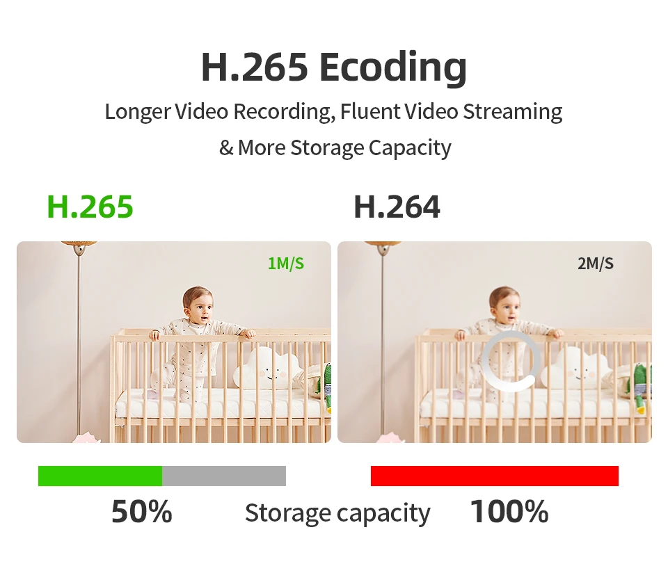 La codificación avanzada de vídeo H.265 es más rápida, suave, más eficiente y ahorra almacenamiento, logra un menor uso de almacenamiento y una transmisión de vídeo más rápida.