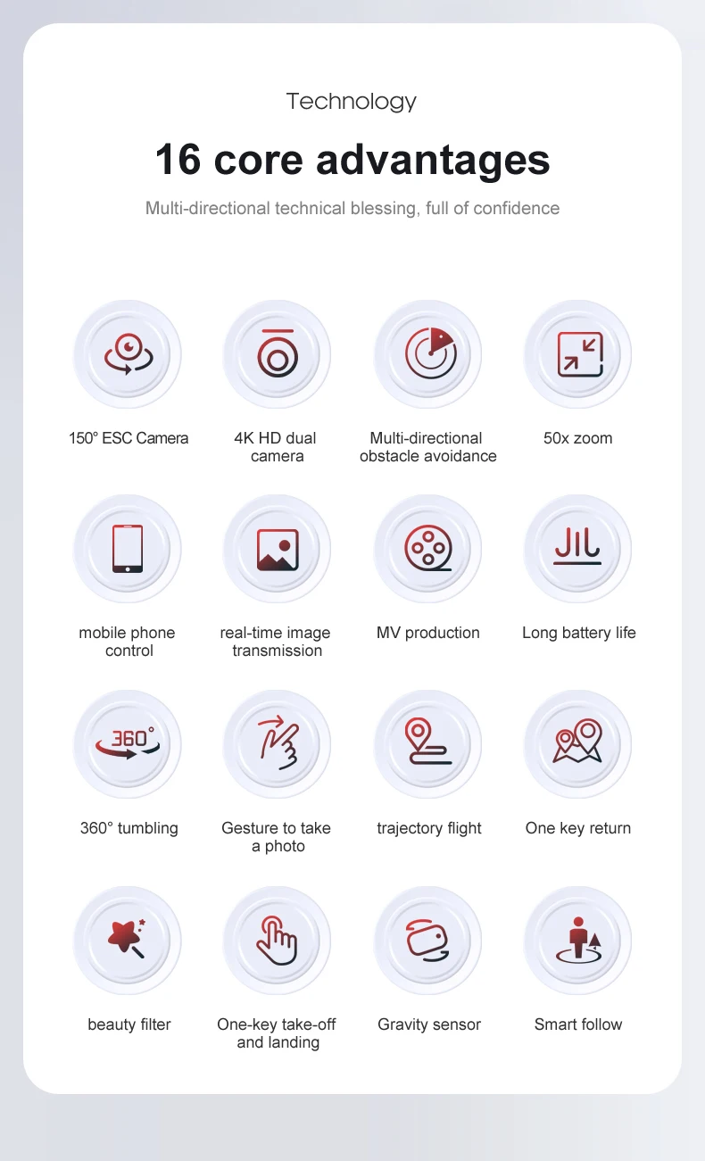 One-click take-off/one-click landing/rise/fall/left/right turn/360 ° roll/headless mode/fast and slow gear/take pictures/record/switch dual cameras/facial recognition automatic photo/gravity sensing/trajectory flight