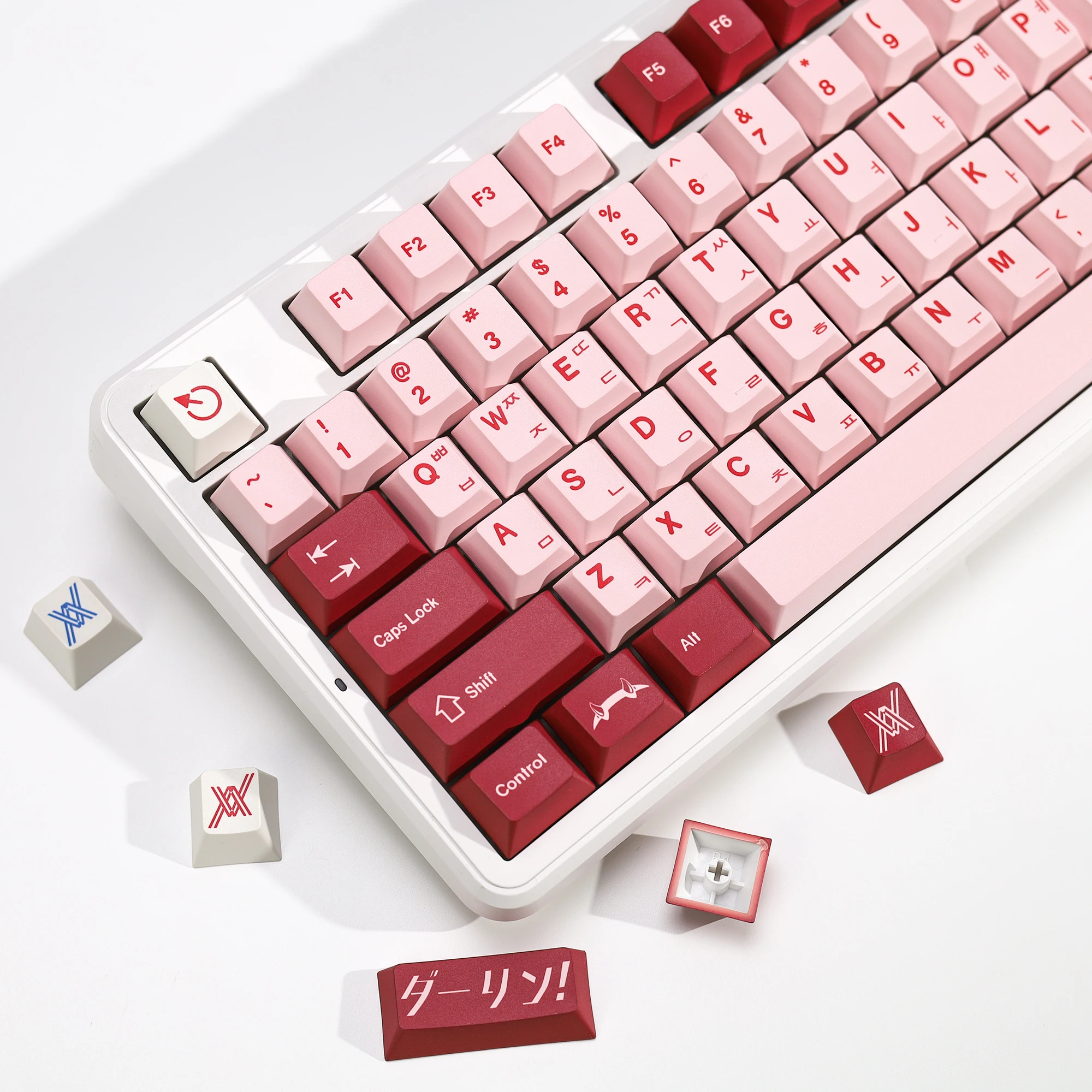 Modelo: KBDiy CloneGMK DarlingTecla Idioma: coreano/japonés Teclas totales: juego de teclas de 143 teclas Perfil: perfil KBDiy Cherry Material: plástico PBT Método de impresión: sublimación de cinco caras