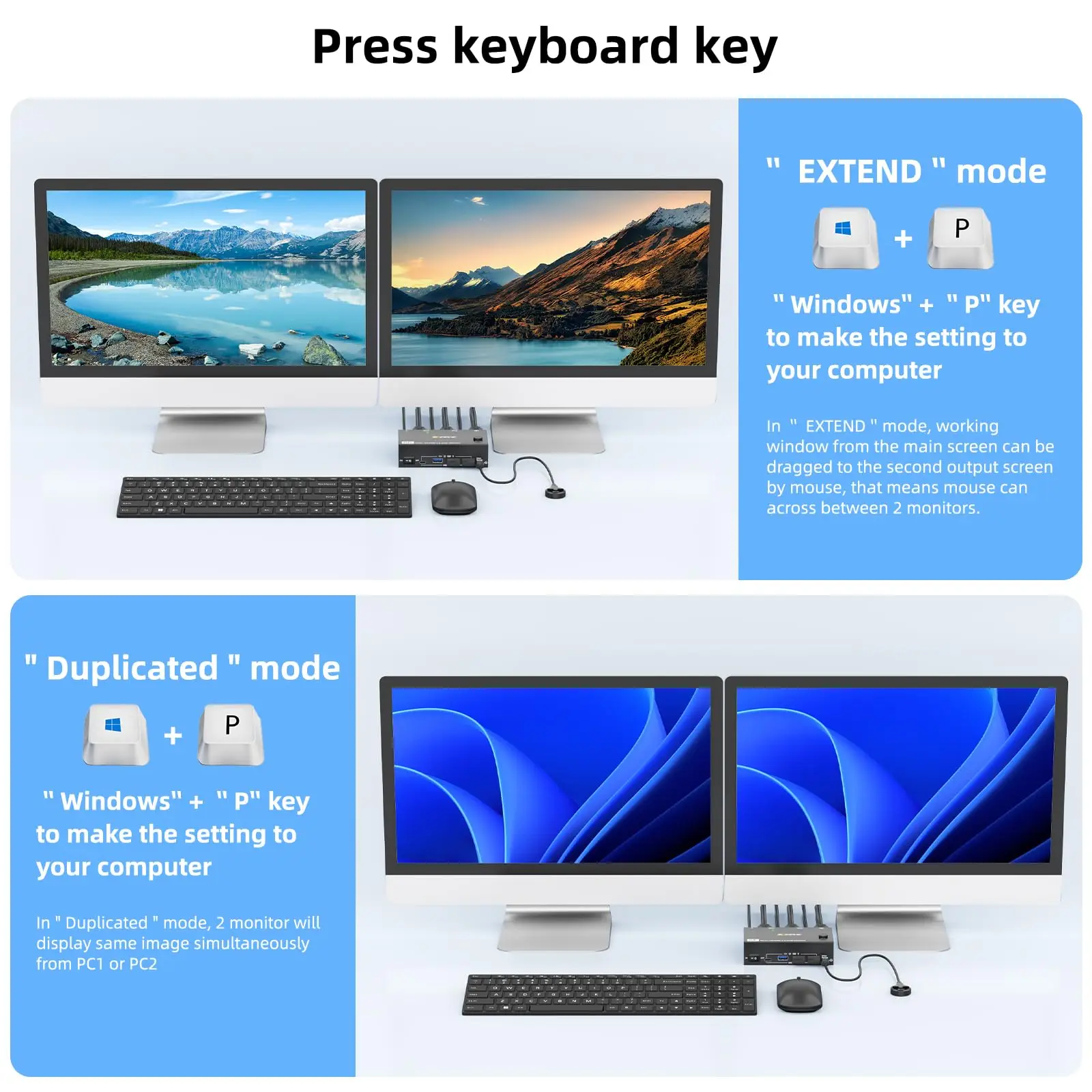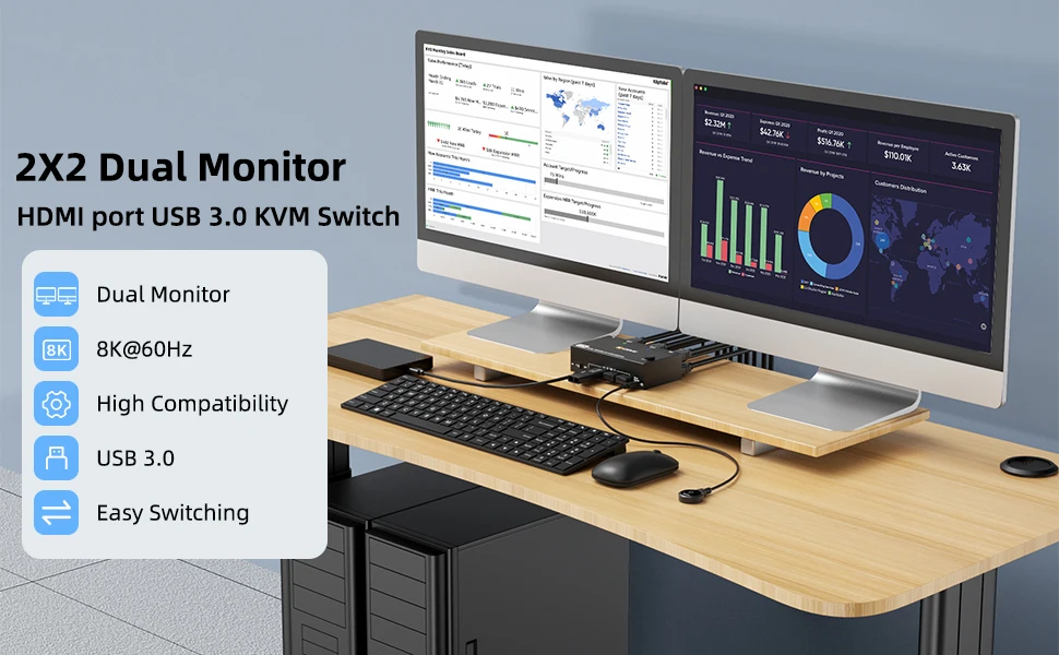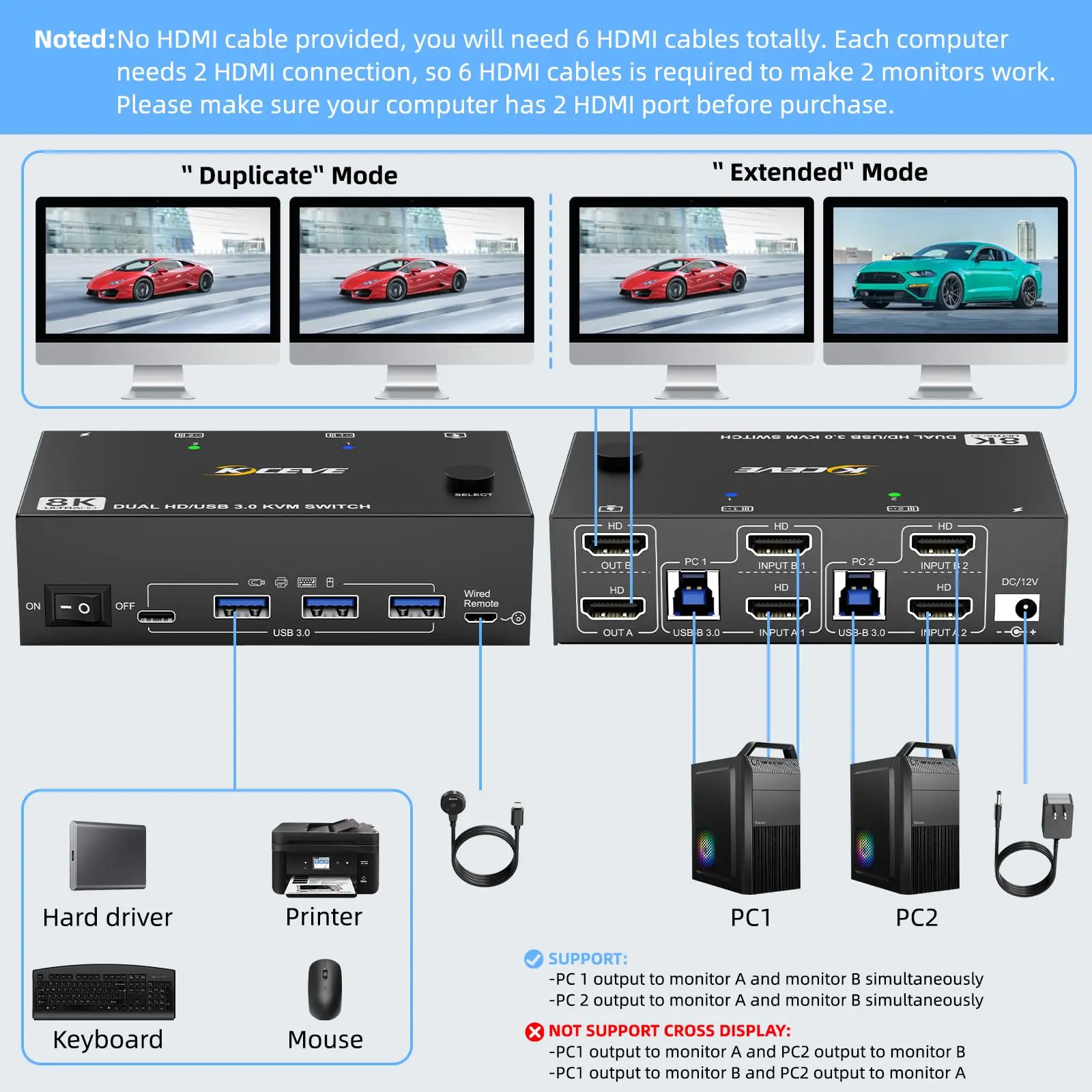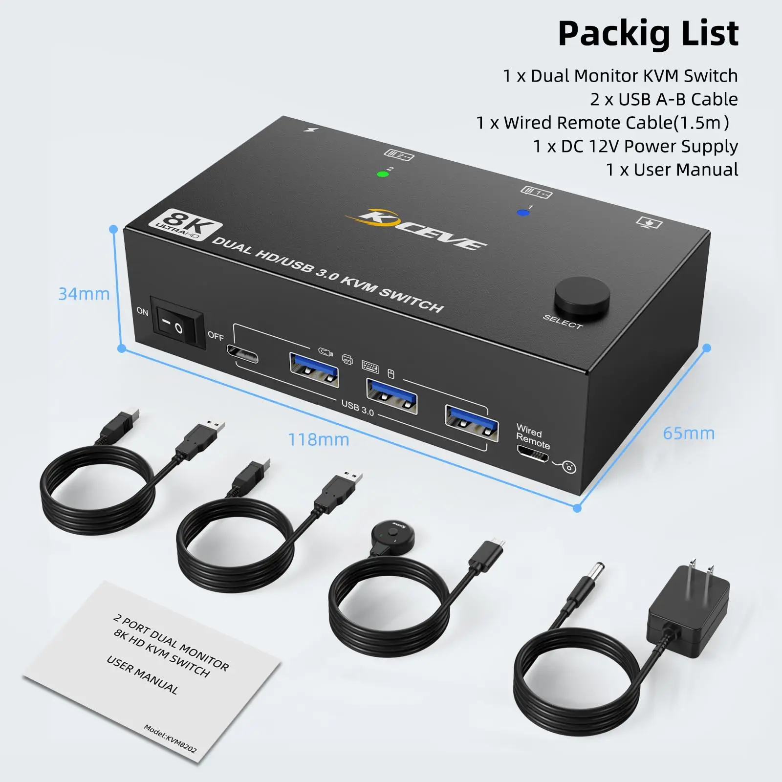 Comprar KCEVE-interruptor KVM 8K, 2 monitores, Monitor Dual USB 3,0, HDMI, KVM, compatible con 7680x4320 @ 60Hz para 2 ordenadores
