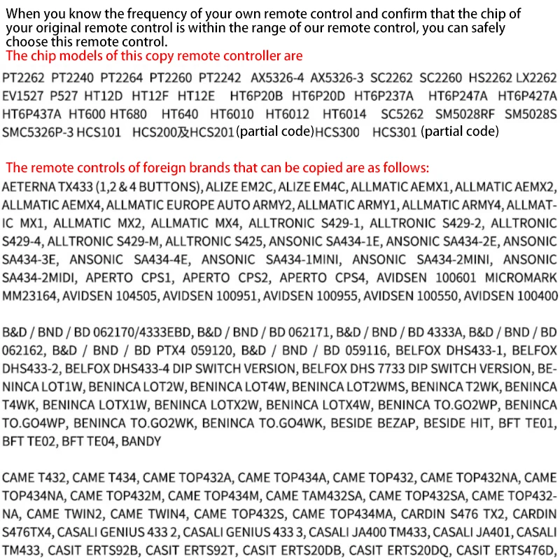 Este control remoto de copia inteligente es adecuado para control remoto de puertas eléctricas, control remoto de puertas telescópicas y control remoto de puertas de garaje.