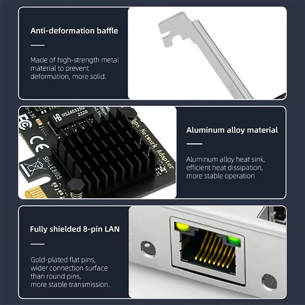 • Redes de alta velocidad: experimente una conectividad a Internet perfecta con esta tarjeta de red, que cuenta con una velocidad de transmisión de 1000 Mbps y 2,5 Gbps, lo que garantiza una transferencia de datos rápida y eficiente.