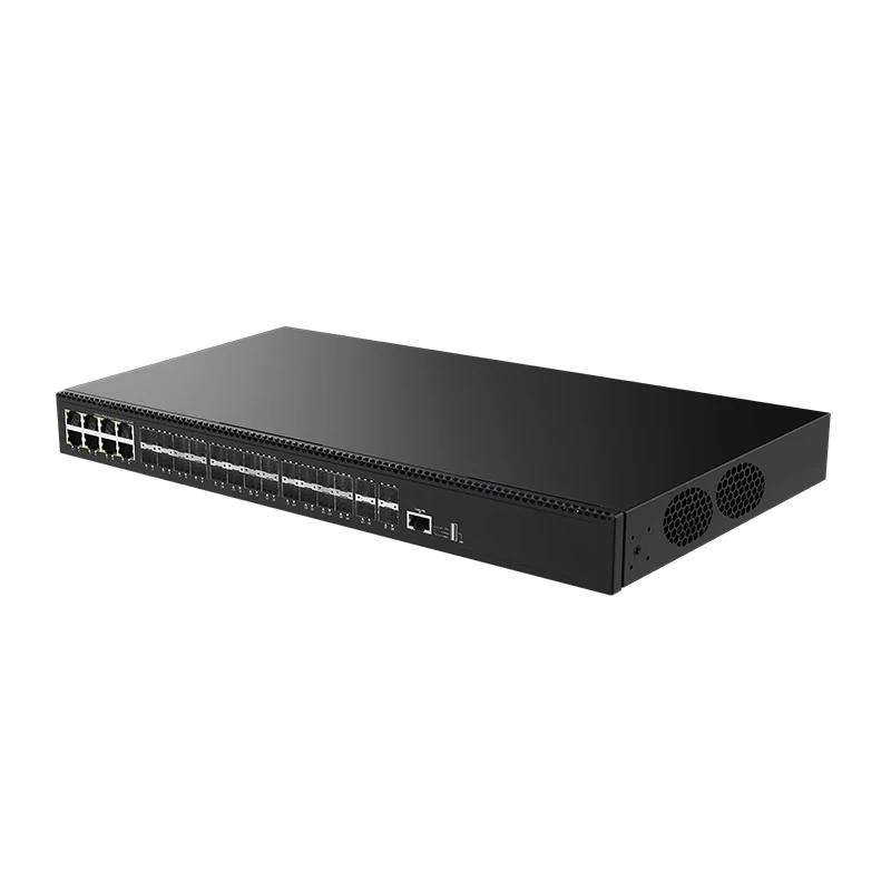 20 puertos SFP 1G + 8 puertos COMBO SFP/RJ45 1G, 1 puerto de consola RJ45 para Administración y configuración básica del conmutador