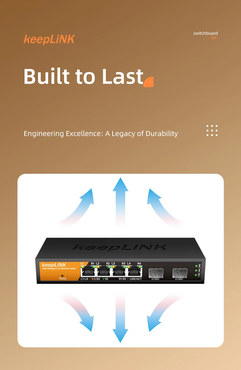 The KeepLink 6-port Multi-Gigabit managed Switch, KP-9000-6XHML-X2, helps businesses cost effectively expand their networks with multi-gig speeds. The KP-9000-6XHML-X2 Multi-Gigabit Ethernet switch comes with four(4) 2.5G ports and two(2) 10G SFP+ port in a metal case and can be placed on a desk or mounted on a wall with the included wall-mount kit. This switch is energy efficient, built to last, and rigorously tested to provide the reliability businesses need. 802.1p traffic prioritization and jumbo frame support allow for seamless integration with more sophisticated networks.