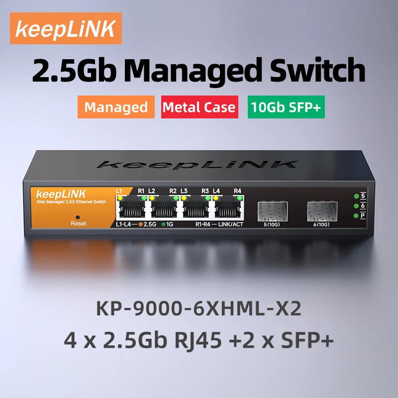 The KeepLink 6-port Multi-Gigabit managed Switch, KP-9000-6XHML-X2, helps businesses cost effectively expand their networks with multi-gig speeds. The KP-9000-6XHML-X2 Multi-Gigabit Ethernet switch comes with four(4) 2.5G ports and two(2) 10G SFP+ port in a metal case and can be placed on a desk or mounted on a wall with the included wall-mount kit. This switch is energy efficient, built to last, and rigorously tested to provide the reliability businesses need. 802.1p traffic prioritization and jumbo frame support allow for seamless integration with more sophisticated networks.