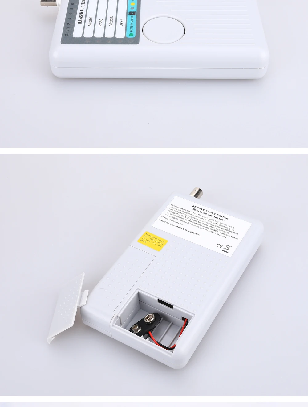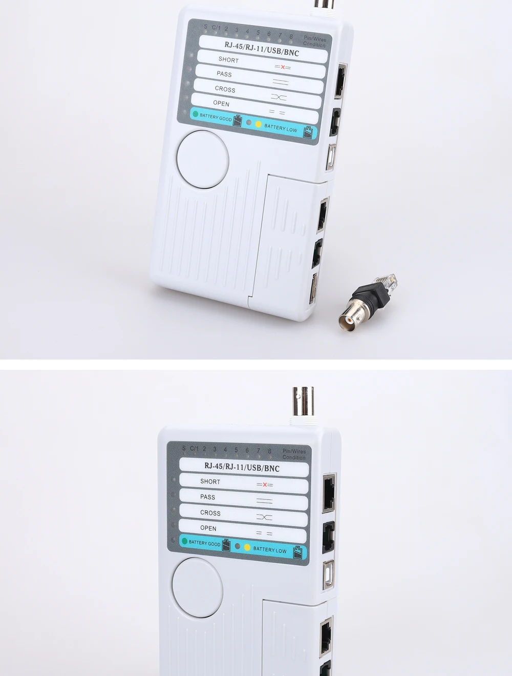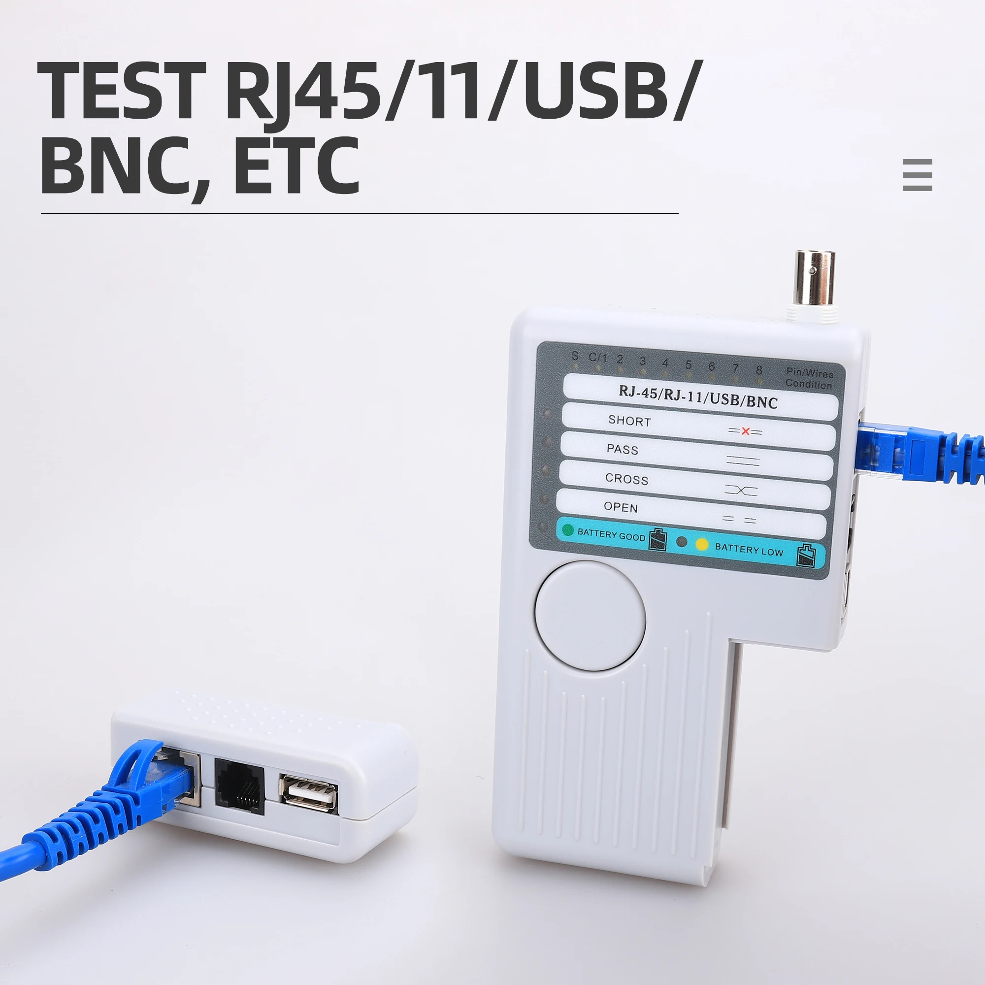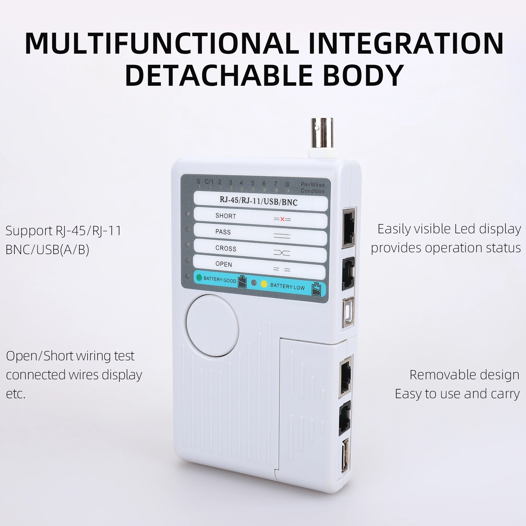Funciones principales:1. Prueba 4 tipos de cables: RJ11/ RJ45/ USB/ BNC.2. Distancia de prueba: 600 pies.3. Los LED indican conexiones y fallas.4. Prueba sencilla con un solo botón.5. Módulo desmontable para probar puntos remotos.Atención:1. No conecte líneas de alto voltaje para evitar quemar la máquina.2. Colóquelo lastimar a otros en el lugar correcto para evitar, debido a la parte afilada.3. Conecte el cable al puerto correcto.