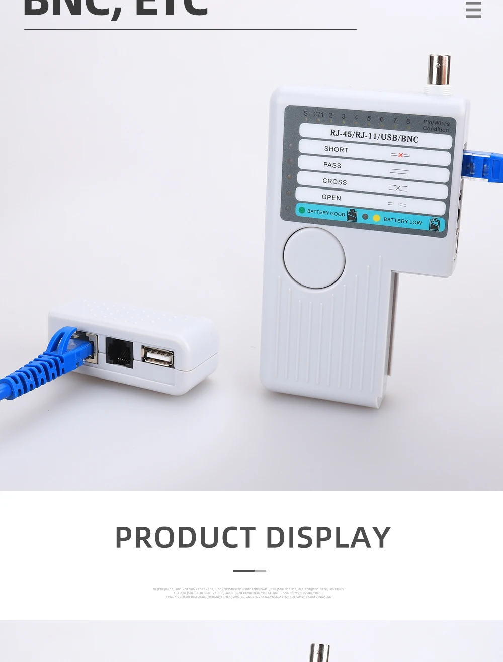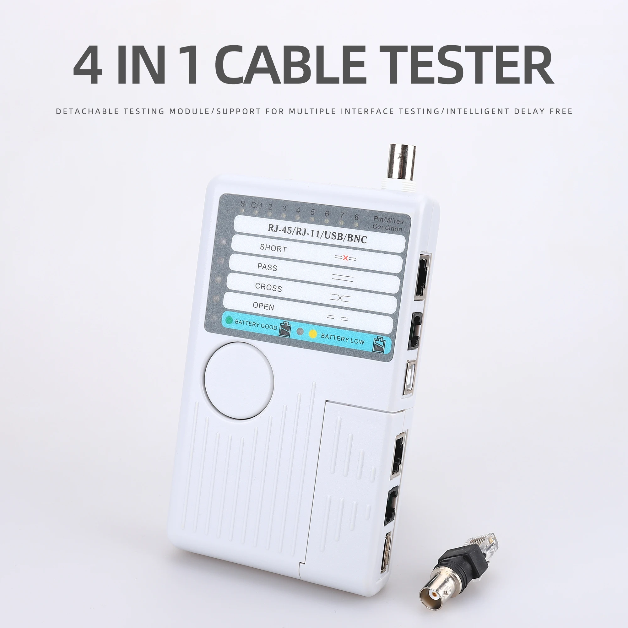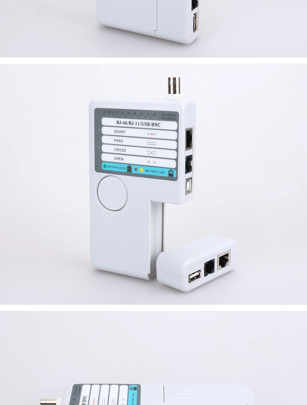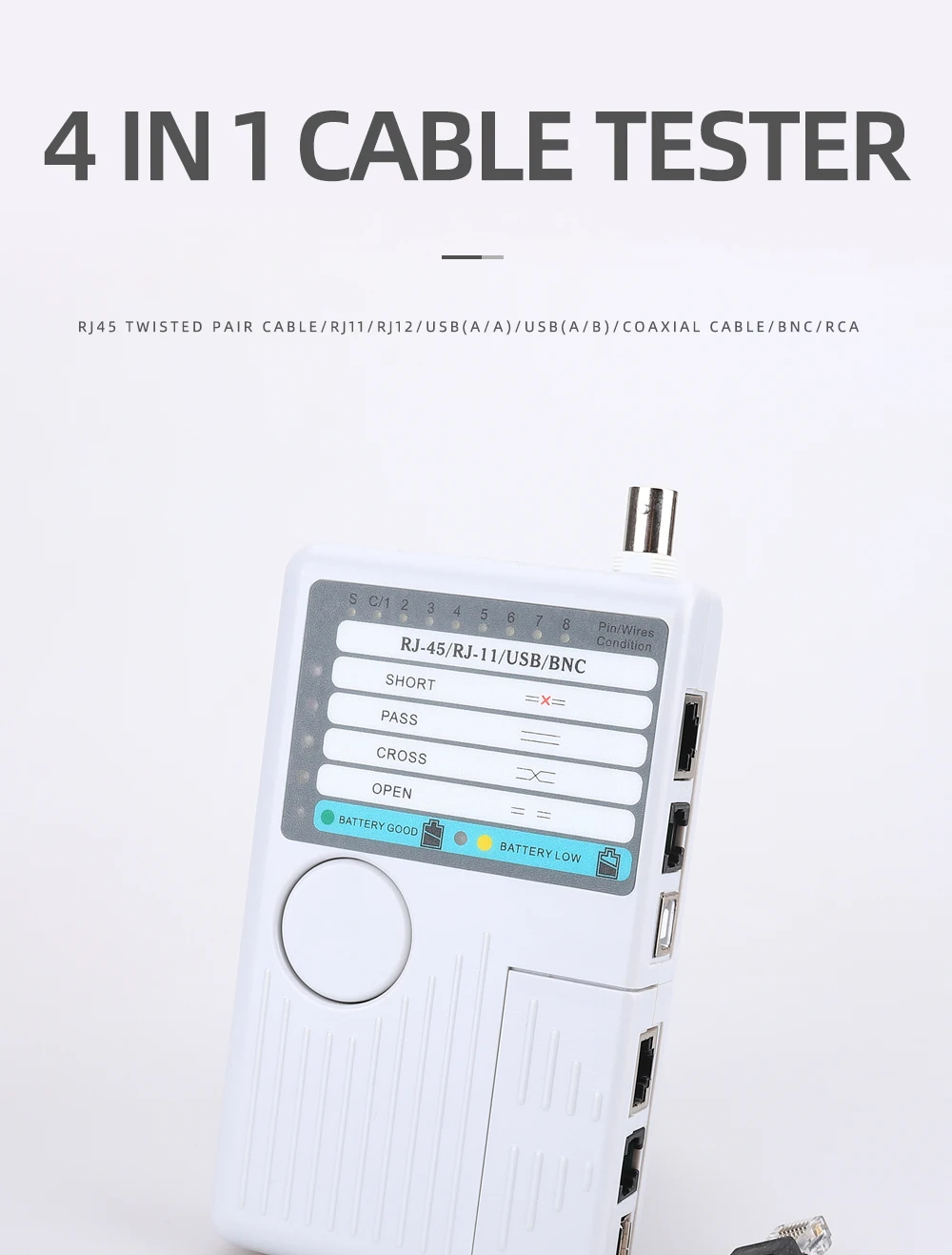 Funciones principales:1. Prueba 4 tipos de cables: RJ11/ RJ45/ USB/ BNC.2. Distancia de prueba: 600 pies.3. Los LED indican conexiones y fallas.4. Prueba sencilla con un solo botón.5. Módulo desmontable para probar puntos remotos.Atención:1. No conecte líneas de alto voltaje para evitar quemar la máquina.2. Colóquelo lastimar a otros en el lugar correcto para evitar, debido a la parte afilada.3. Conecte el cable al puerto correcto.
