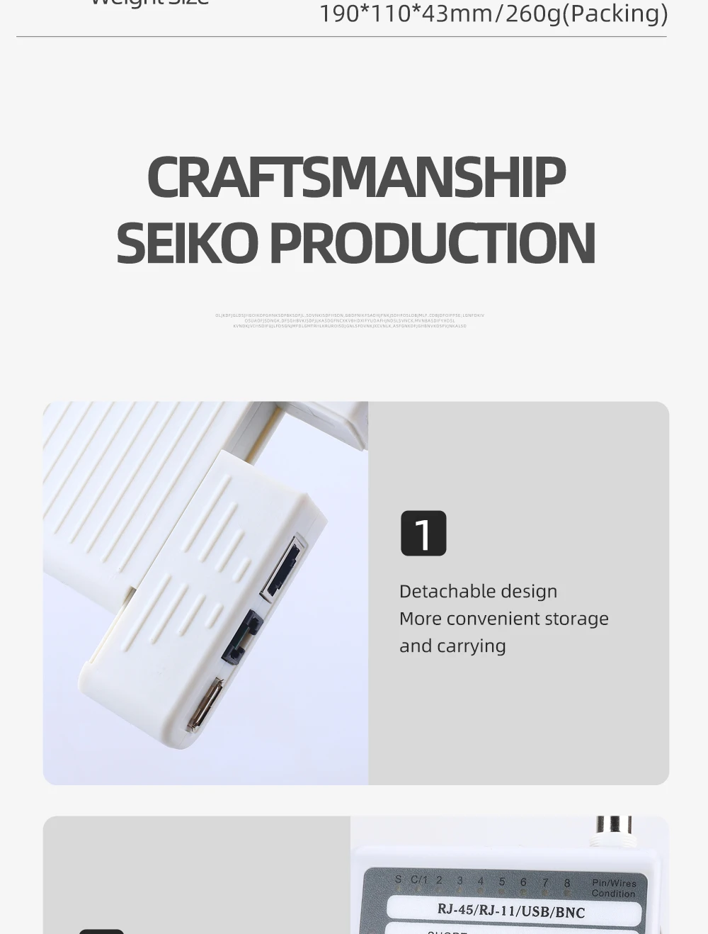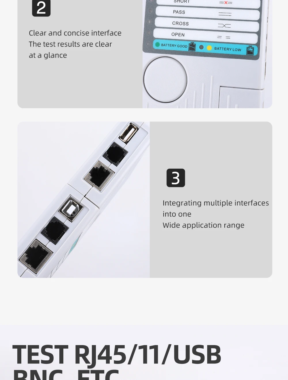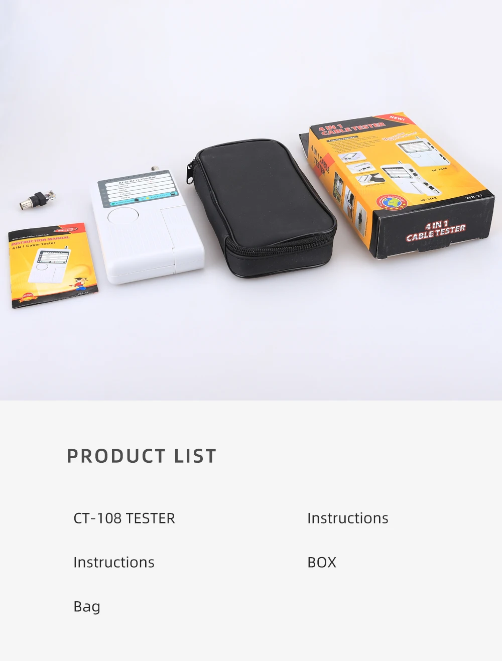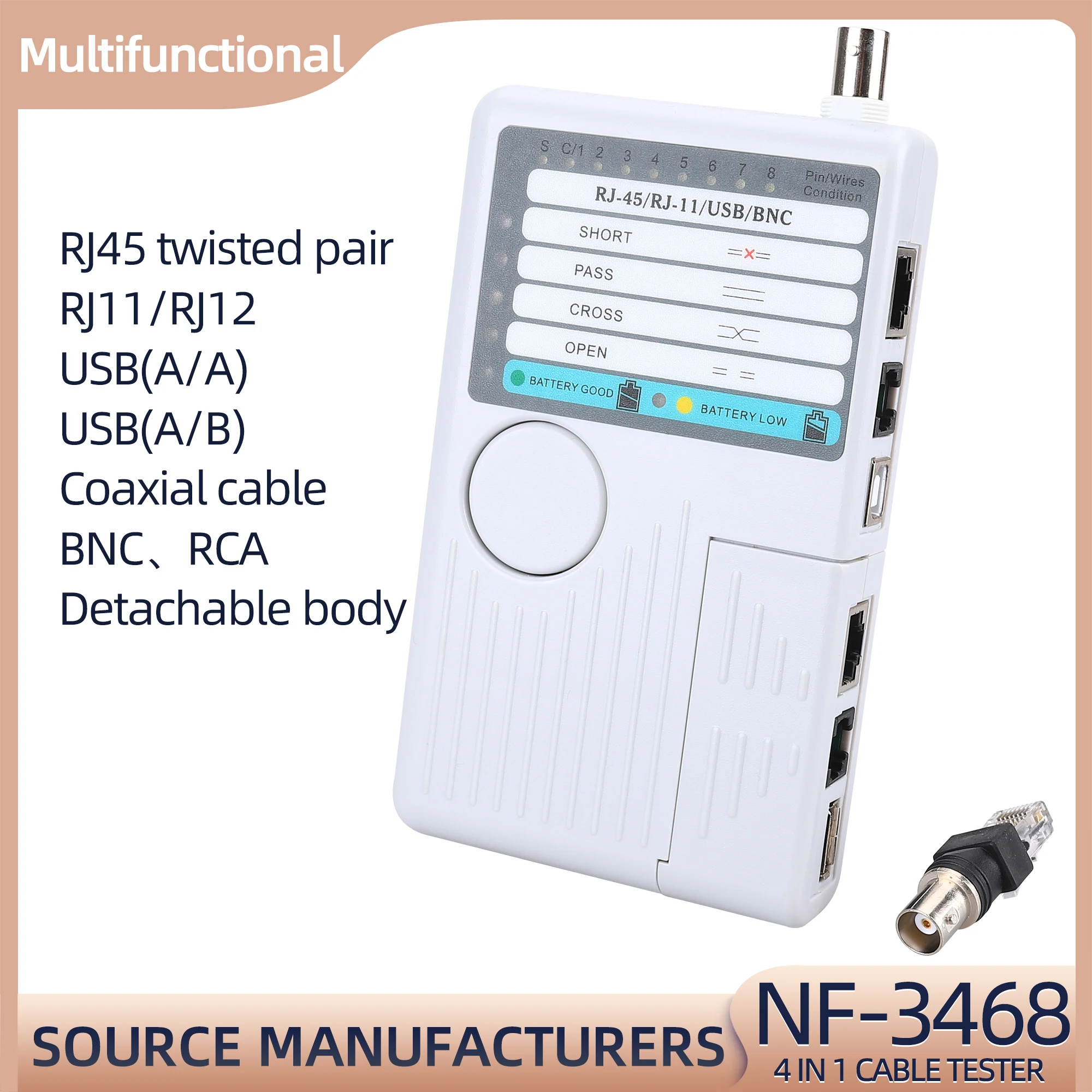 Funciones principales:1. Prueba 4 tipos de cables: RJ11/ RJ45/ USB/ BNC.2. Distancia de prueba: 600 pies.3. Los LED indican conexiones y fallas.4. Prueba sencilla con un solo botón.5. Módulo desmontable para probar puntos remotos.Atención:1. No conecte líneas de alto voltaje para evitar quemar la máquina.2. Colóquelo lastimar a otros en el lugar correcto para evitar, debido a la parte afilada.3. Conecte el cable al puerto correcto.
