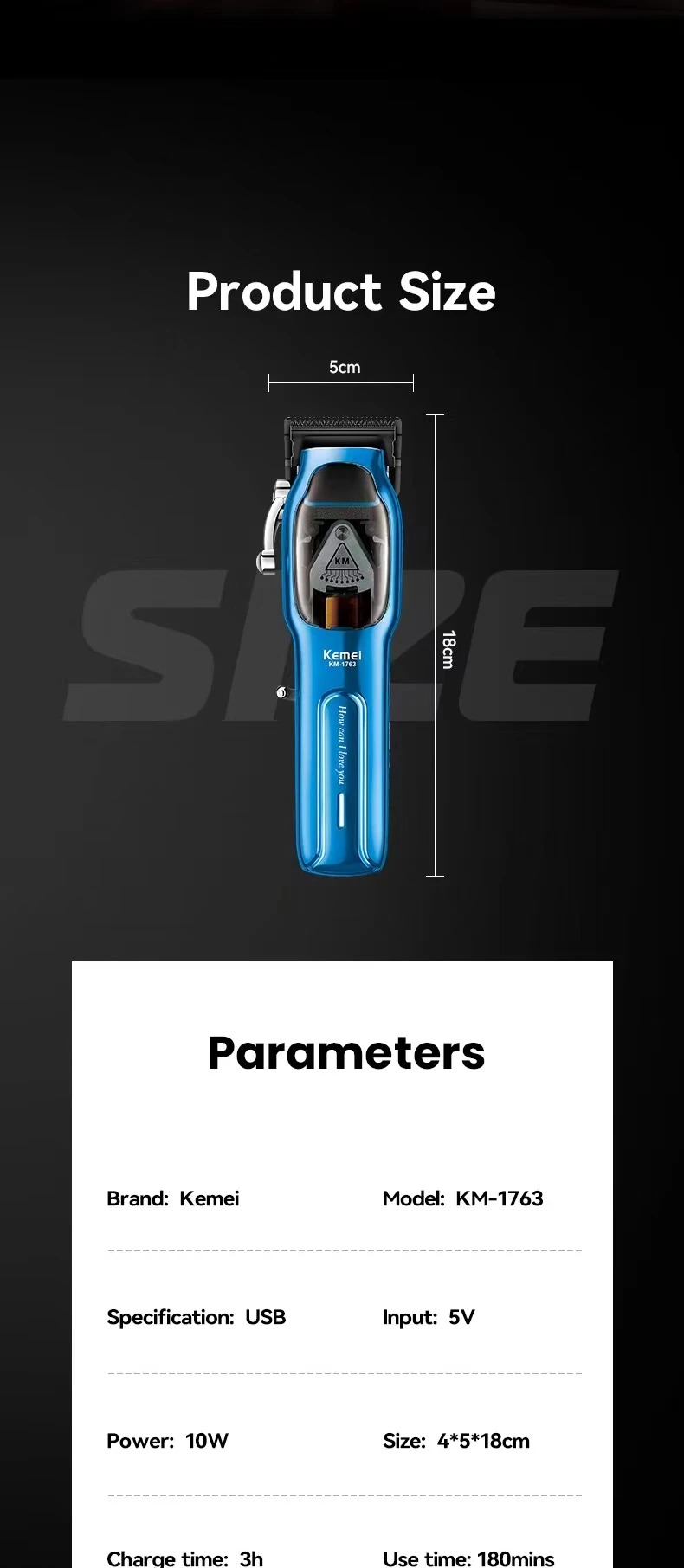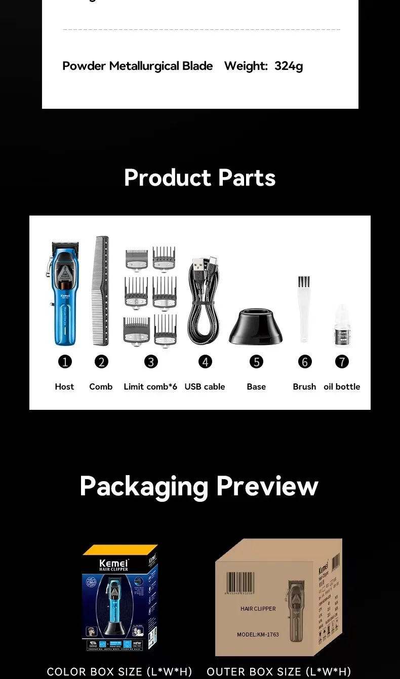 • Material de acero inoxidable :El cortador de pelo Kemei KM-1763 está hecho de acero inoxidable, garantizando durabilidad y resistencia al desgaste.