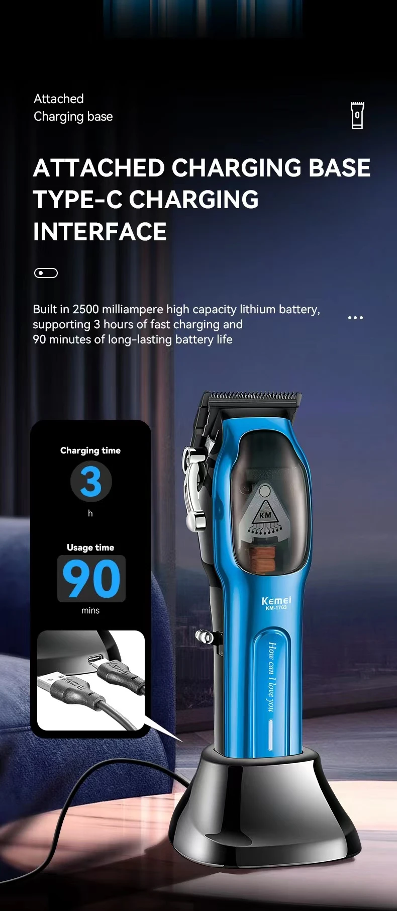 Eficiencia de carga, haciendo que su proceso de corte de pelo sea más conveniente