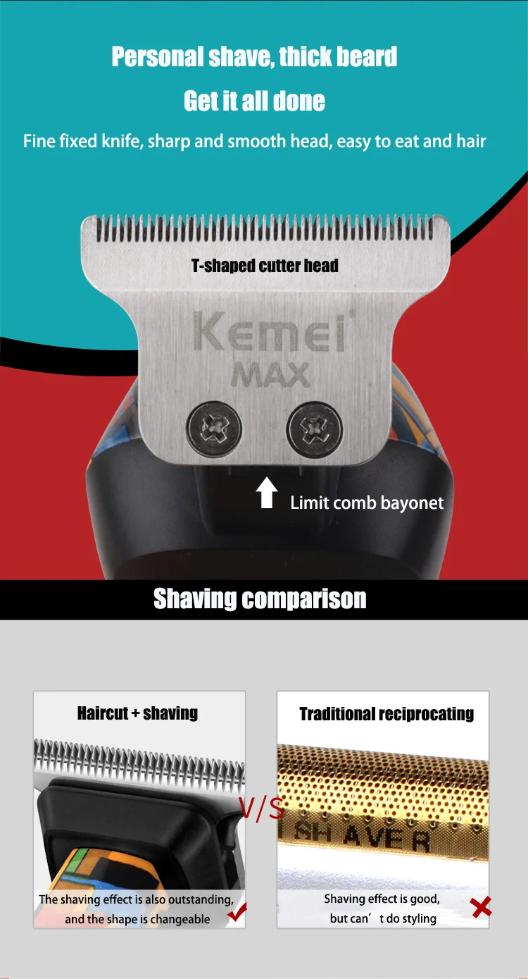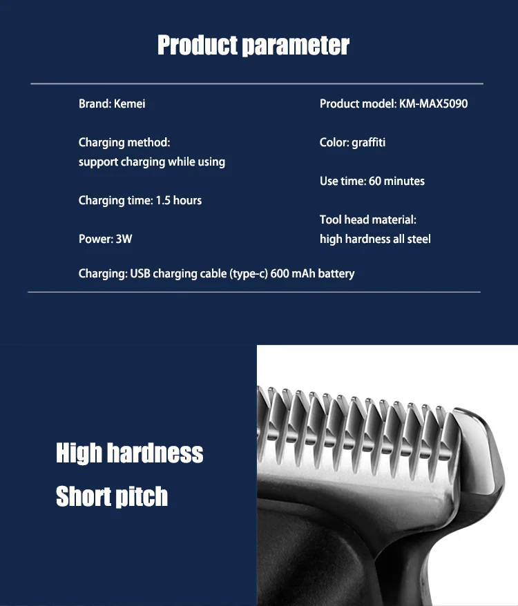 • USB recargable:Las cortadoras de pelo eléctricas Kemei km max5090 son recargables por USB, ofreciendo comodidad y flexibilidad en el manejo del cabello. ¡Solo Conéctate y vete!