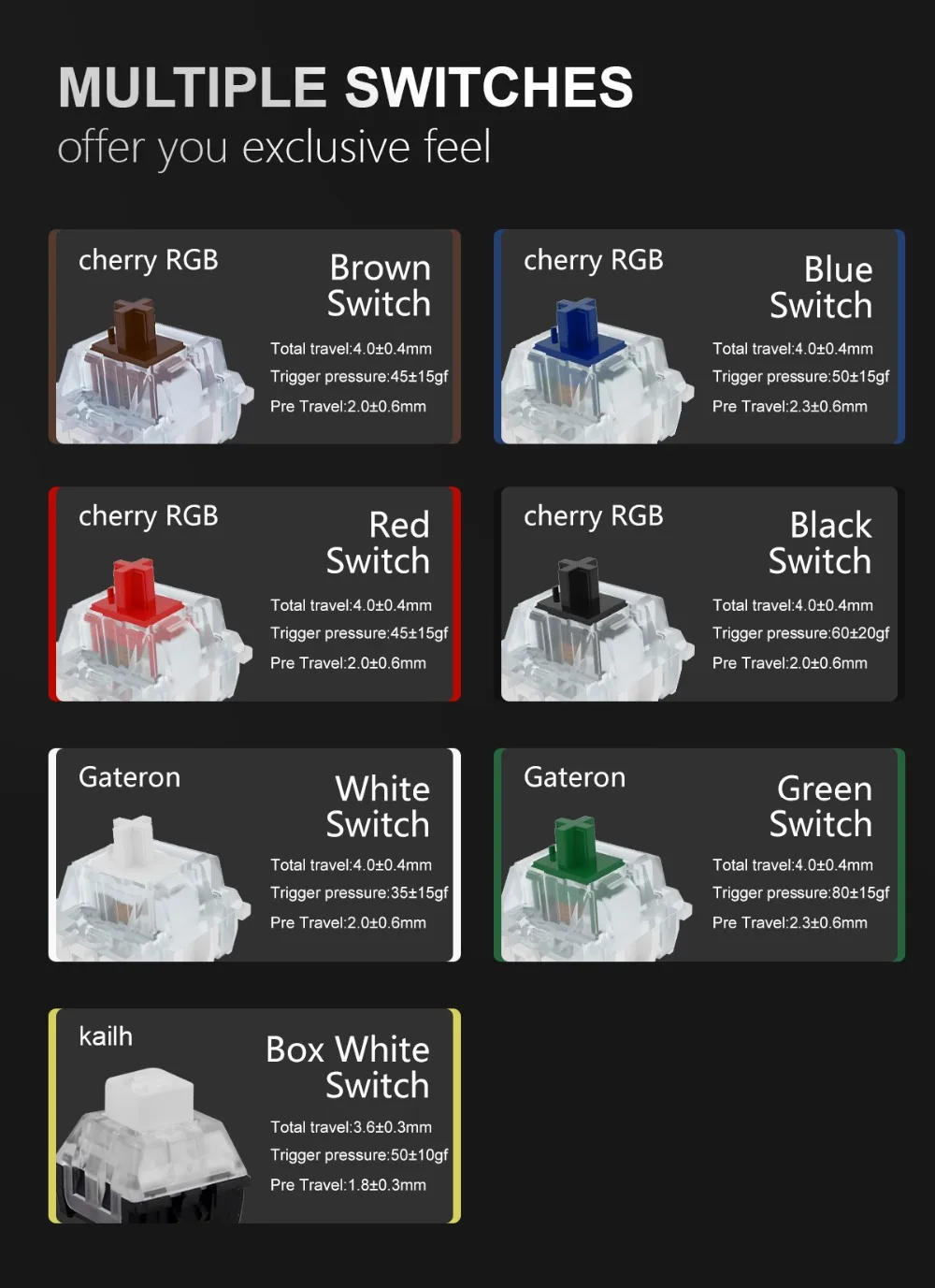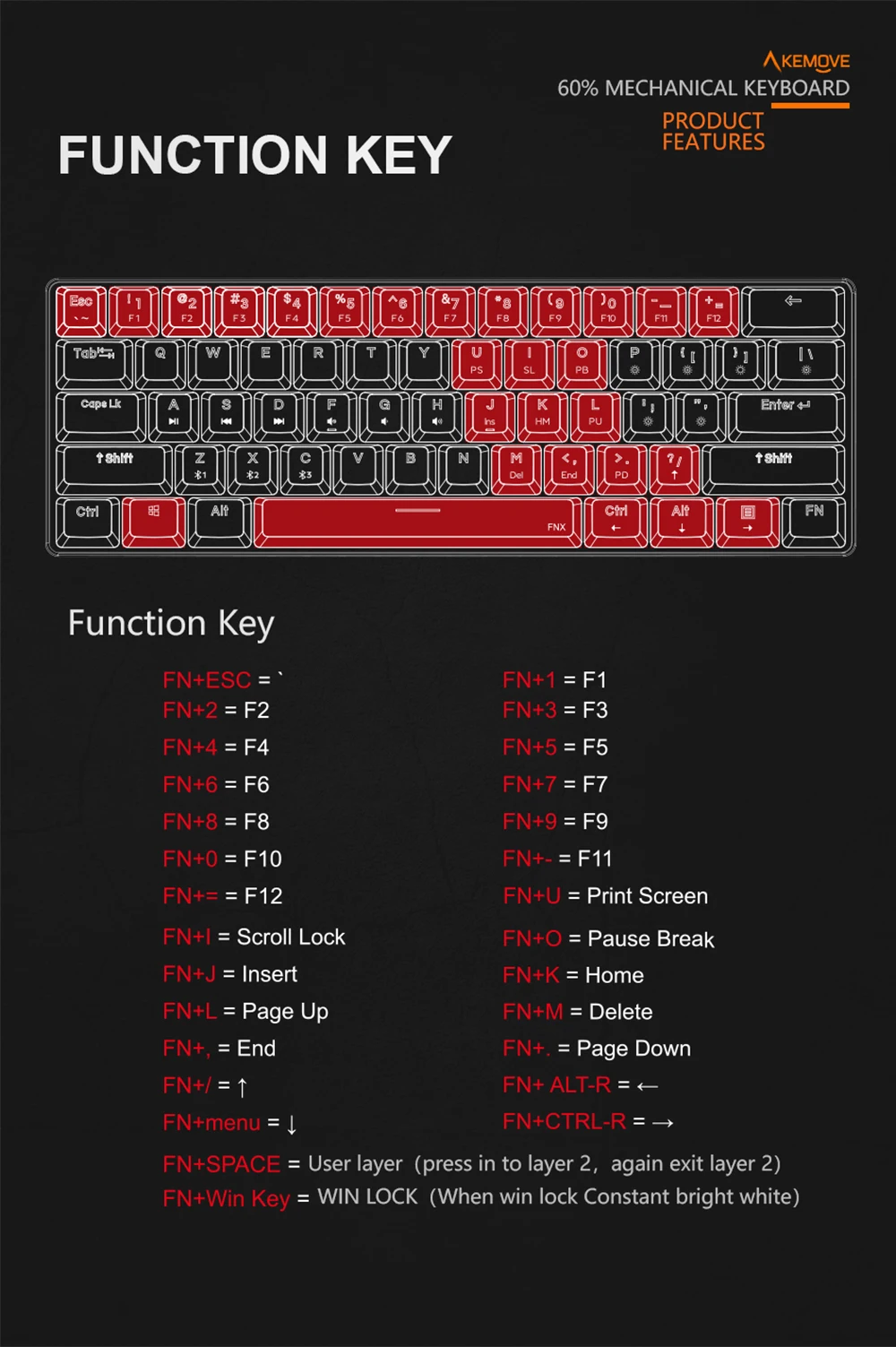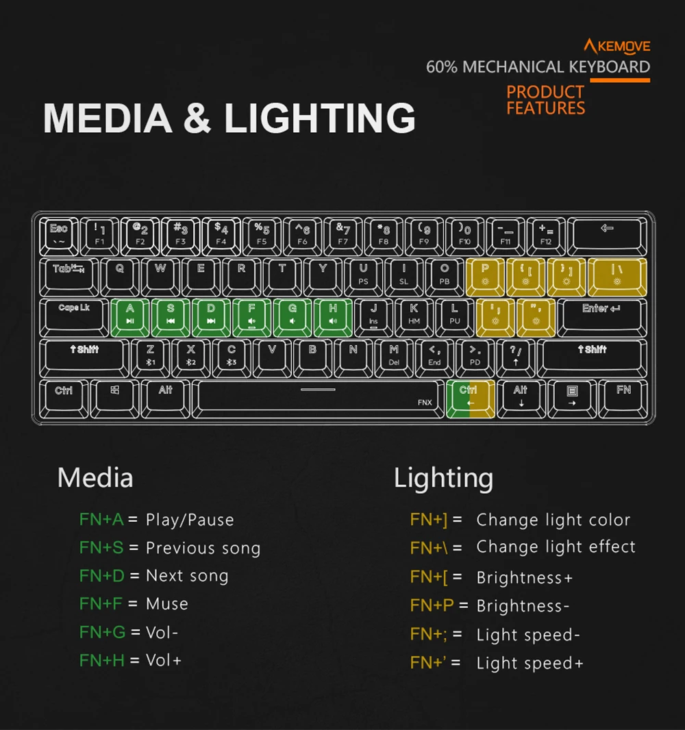 Teclado KEMOVE61Marca: KEMOVEModelo: SnowFox/ ShadowCantidad de llaves: 61 llavesColor: Blanco/negroInterruptor: Interruptor Gateron (interruptor azul, interruptor marrón, interruptor rojo)Conexión: USB tipo C con cable Bluetooth 5,1Material: moldeo por inyección de dos colores completamente cerrado PBTCable: cable USB de 1,5 mTamaño: 293*103*38mmPeso: 768GSoporte del sistema: Windows /Android/MacLlave anti-fantasma: NKRORetroiluminación: retroiluminación RGBBatería: 3000ma