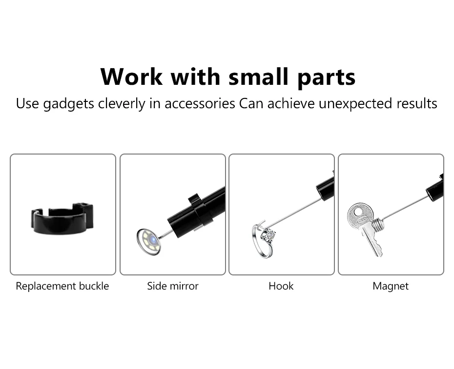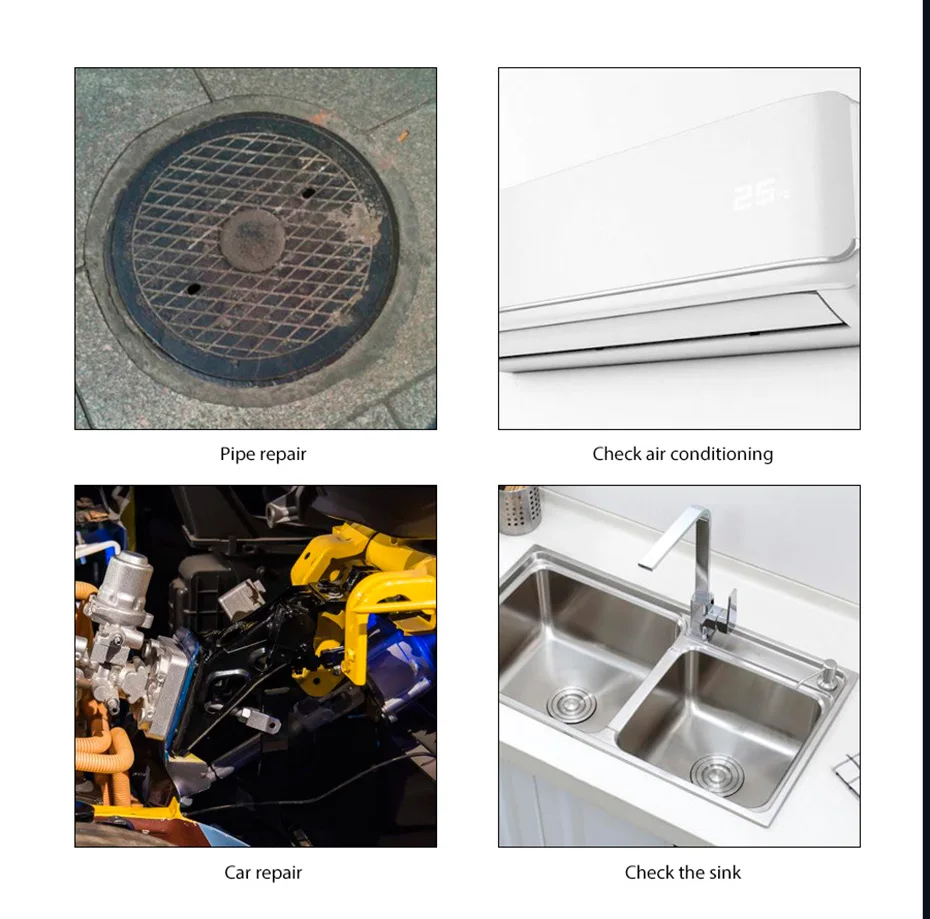 Cámara de alcance adecuada para diversas escenas, como dentro del automóvil o alrededor del motor, dentro de la inspección de tuberías o el molde de inspección de la casa y el cableado. La Luz de brillo ajustable le permite obtener información de imagen incluso en entornos oscuros.