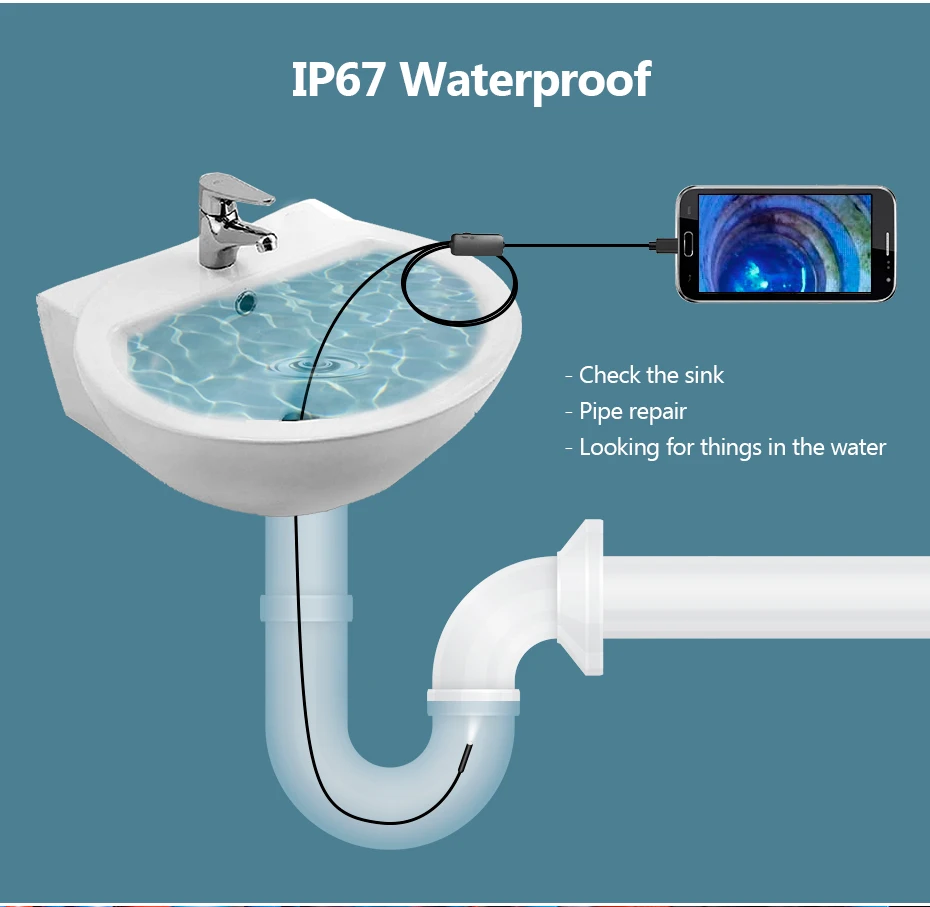 • Clasificación impermeable IP67:Con una clasificación de impermeabilidad IP67, esta Cámara endoscópica se puede utilizar en ambientes húmedos sin ninguna preocupación, por lo que es ideal para la inspección de tuberías.