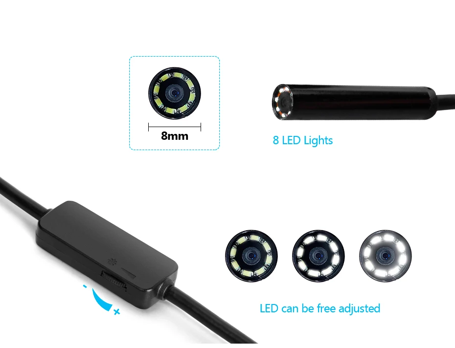 • 8 luces LED ajustables:La Cámara endoscópica viene con 8 luces LED ajustables que proporcionan una iluminación brillante y clara, lo que facilita la inspección de áreas difíciles de ver.