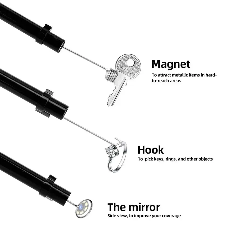 Cámara de alcance adecuada para diversas escenas, como dentro del automóvil o alrededor del motor, dentro de la inspección de tuberías o el molde de inspección de la casa y el cableado. La Luz de brillo ajustable le permite obtener información de imagen incluso en entornos oscuros.