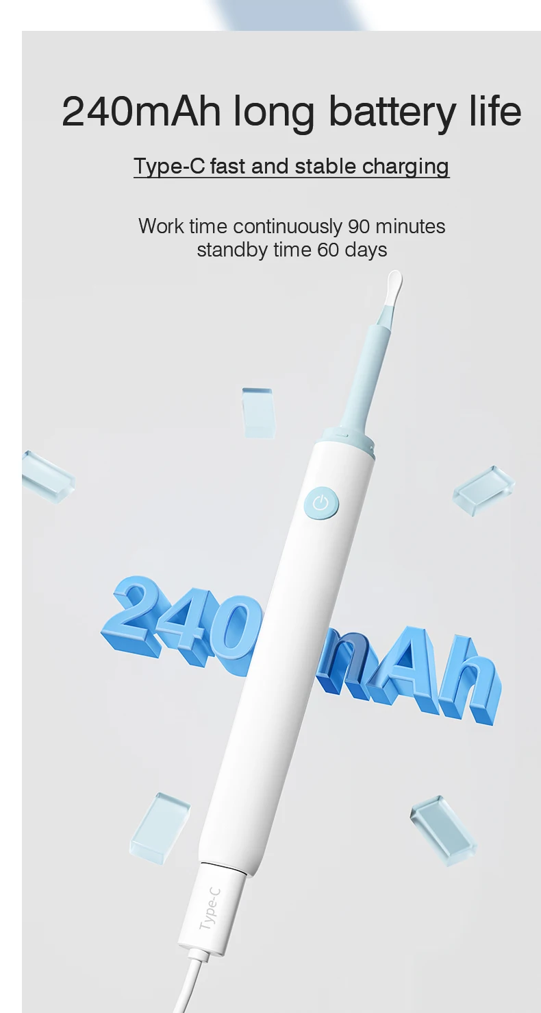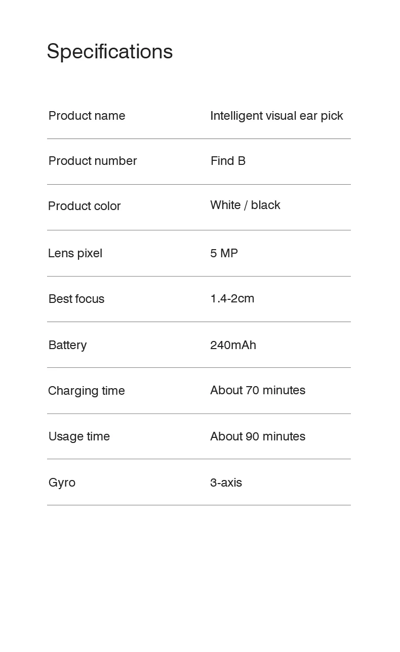 • Seguro y conveniente:Esta cuchara limpiadora de oídos es inalámbrica y visual, lo que garantiza una forma segura y conveniente de limpiar sus oídos sin el riesgo de dañar sus tímpanos.