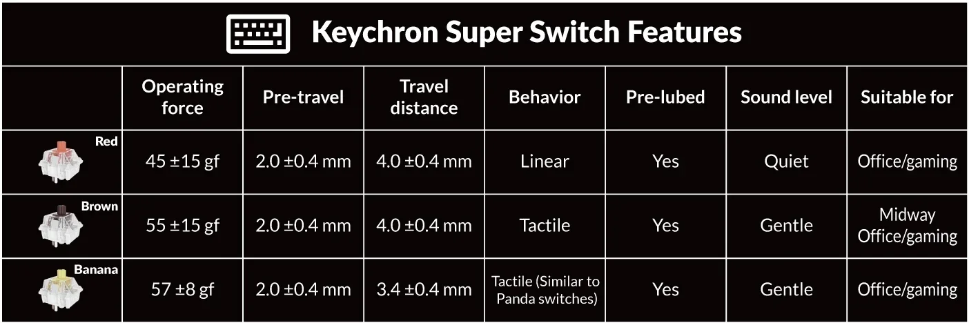 El Keychron Super Switch está diseñado para durar con una vida útil de 50 millones de clics y proporciona gran confiabilidad y alto rendimiento para escritura rápida y juegos competitivos.Ofrece opciones de rojo, marrón y plátano para adaptarse a las preferencias de los diferentes usuarios.Cada interruptor se prueba para determinar su calidad profesional.