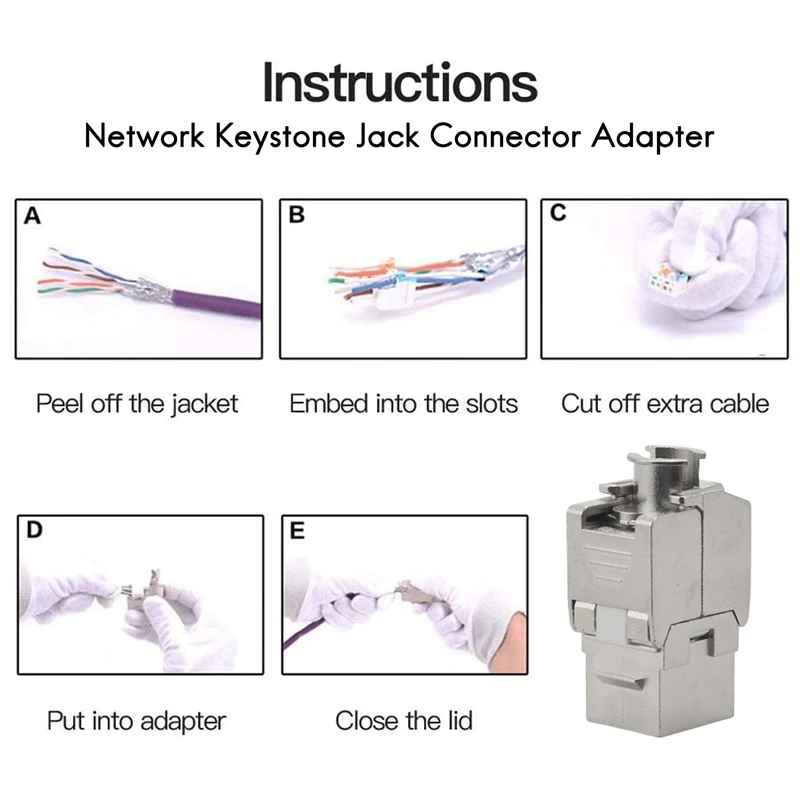 Proporcionamos conectores de estilo tooless keystone Cat7(Cat6a) que hacen una instalación simple sin la necesidad de una herramienta de perforación. Las tomas keystone sin toolls son una solución perfecta para terminar y conectar el cable de red.