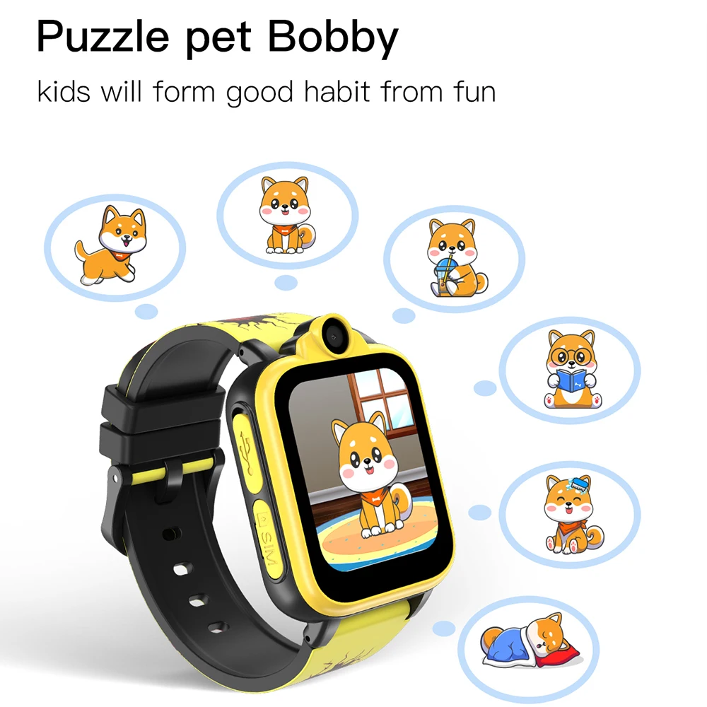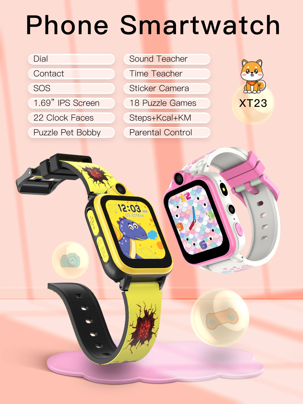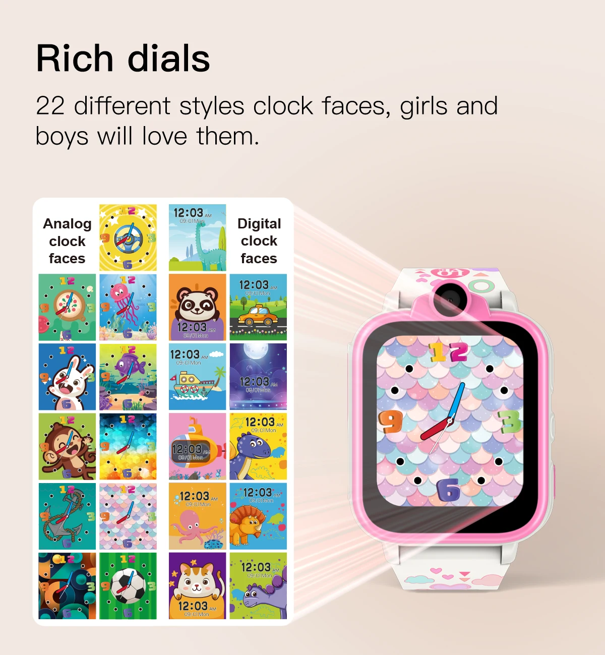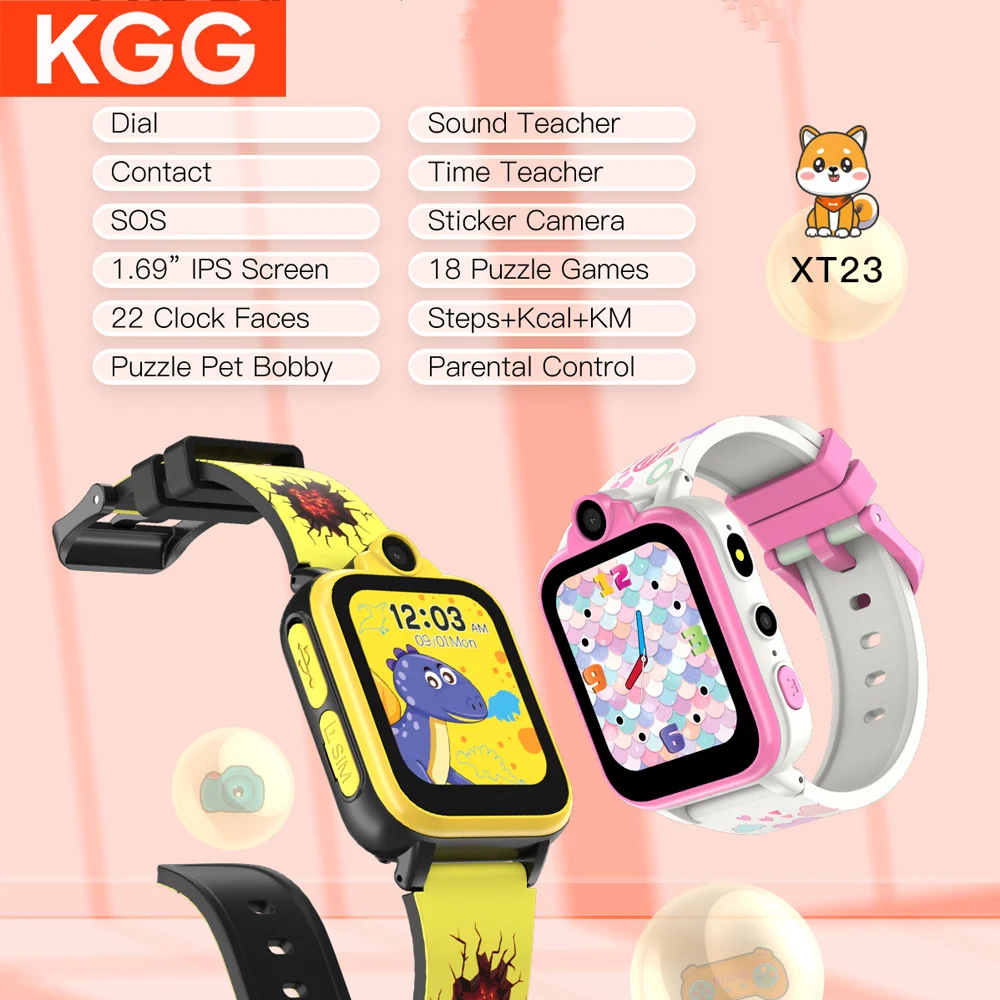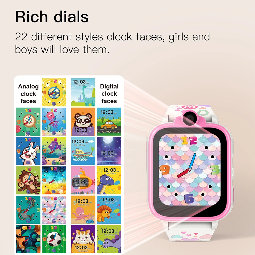 Reloj inteligente KGG con pantalla de 1,69 pulgadas y 22 diales. También viene con 18 juegos educativos para entrenar el pensamiento y la coordinación mano-ojo. Como padre, puede limitar el tiempo de juego utilizando la función de control parental en la configuración.