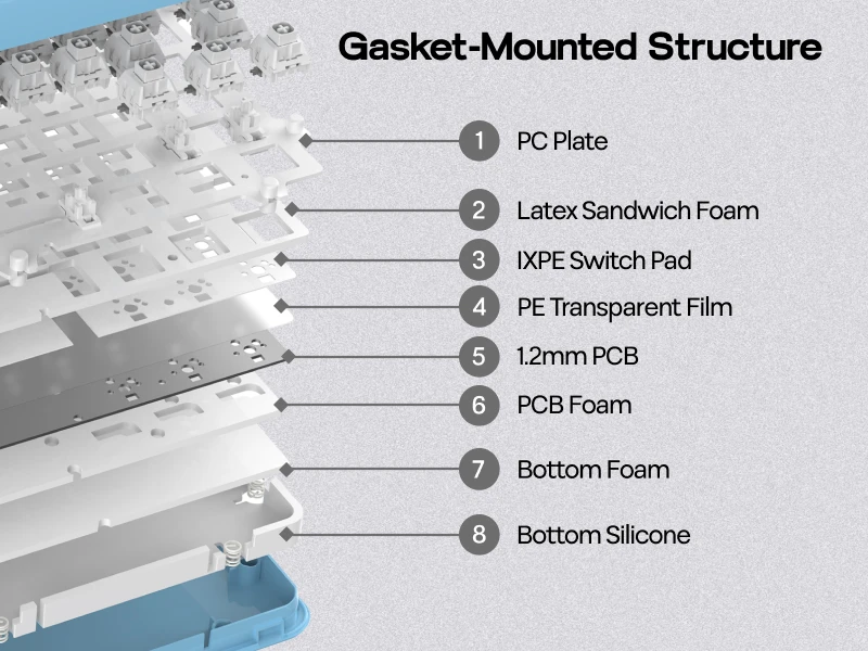Material de amortiguación de sonido: espuma sándwich de látex, almohadilla de interruptor IXPE, película transparente de PE, espuma inferior, espuma de PCB, silicona inferior, junta