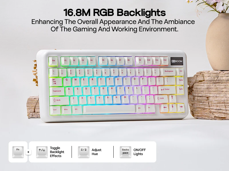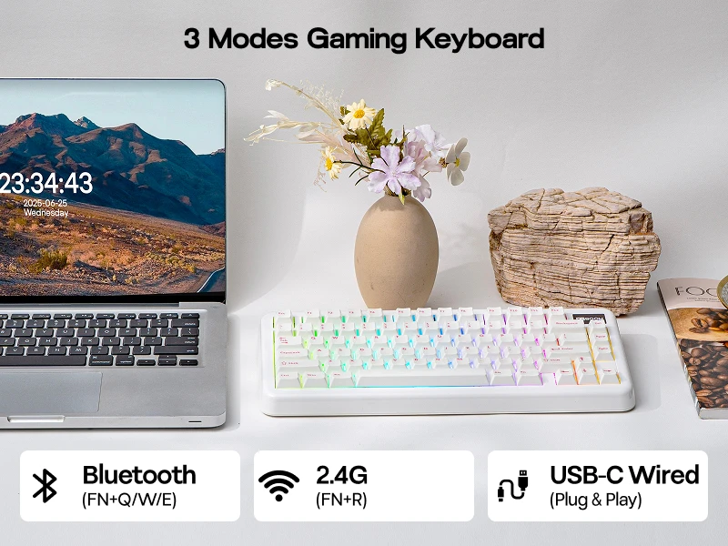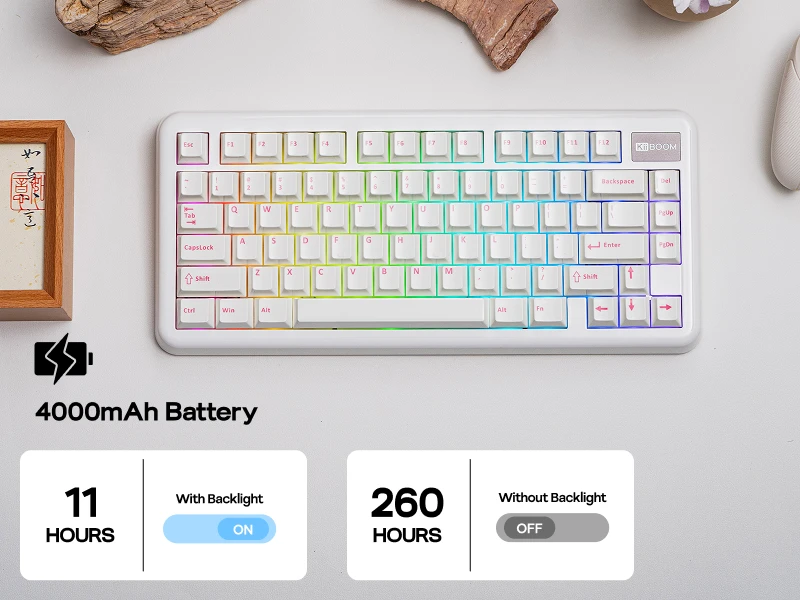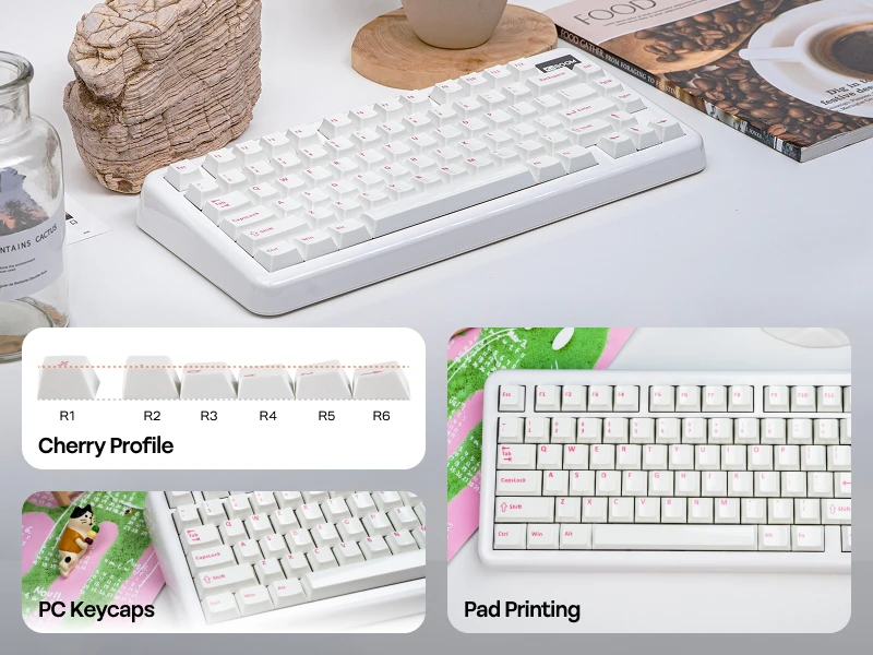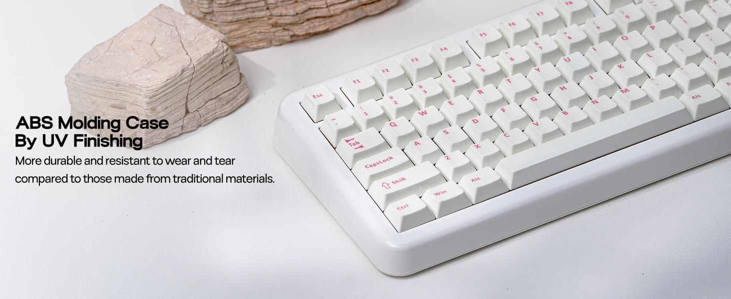 El teclado Phantom81 Lite está diseñado con una moldura de ABS de primera calidad combinada con tecnología UV avanzada, lo que ofrece una durabilidad excepcional y una estética llamativa.La duradera construcción de ABS proporciona resistencia a los rayones y una sensación refinada, mientras que el acabado UV aumenta la intensidad del color y protege contra la decoloración.Perfecto para quienes aprecian la estética junto con la durabilidad, su diseño compacto del 75% optimiza el espacio del escritorio manteniendo la funcionalidad completa, lo que lo hace adecuado para espacios de trabajo minimalistas, entornos de juegos o profesionales móviles.