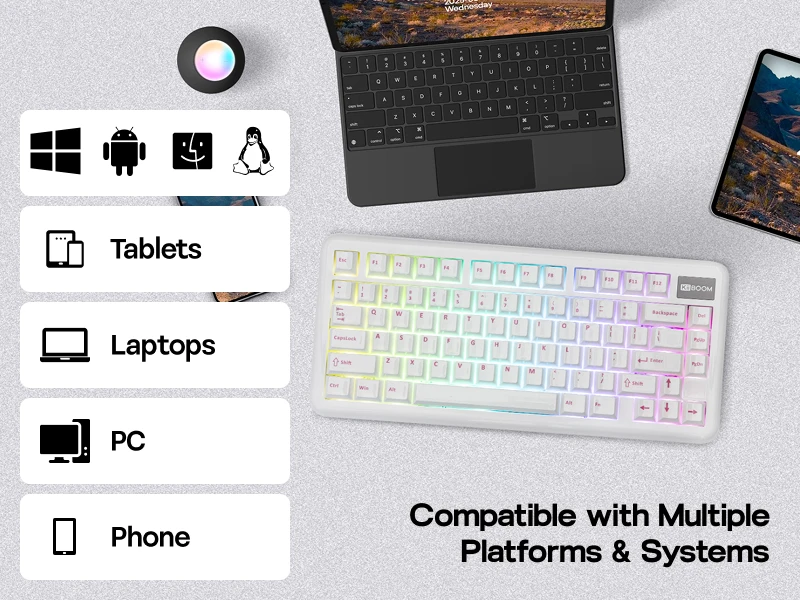 Disfrute de un rendimiento perfecto en juegos y edición de videos con las opciones de conectividad de modo triodo del teclado Phantom81 Lite compatibles con 2,4 GHz, USB-C y Bluetooth 5.0.Gracias a esta función, los usuarios pueden alternar fácilmente entre 5 dispositivos, lo cual es excelente para quienes funcionan de equilibrio en una PC, Mac o tableta.Compatible con WIN, Mac y Linux, este teclado versátil funciona bien en un entorno de oficina y al mismo tiempo funciona como controlador de juegos.
