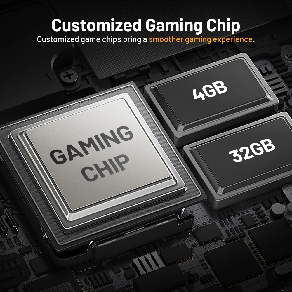 3. chip de juego personalizado y 4 + 32G memoria grande, rendimiento fuerte, para garantizar el buen funcionamiento del sistema y el juego.