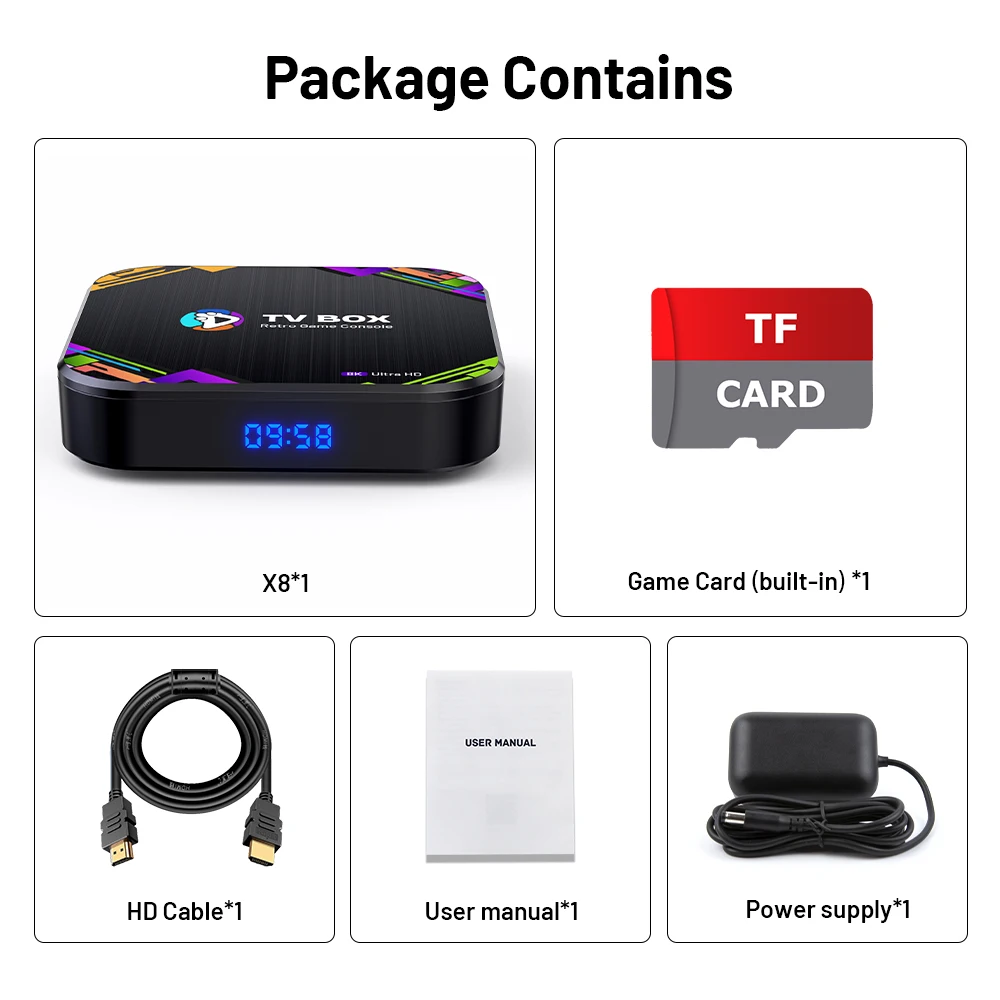 La Super consola X8 está equipada con nuestro chip de juego personalizado y está equipada con una memoria grande de 4 + 32G para garantizar el buen funcionamiento del juego.