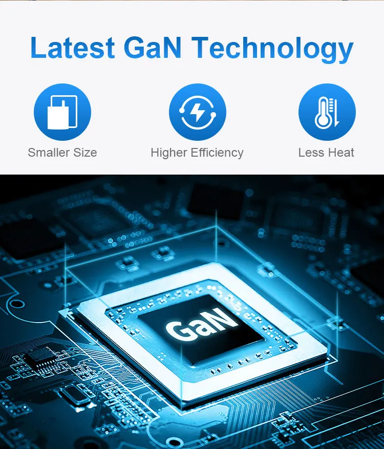 【Última tecnología de chip GAN】 La tecnología GaN no solo reduce el tamaño y el peso del cargador, sino que también genera menos calor, reduce el consumo de energía de manera efectiva y mejora la eficiencia de carga en gran medida, hace que la carga sea más segura y conveniente
