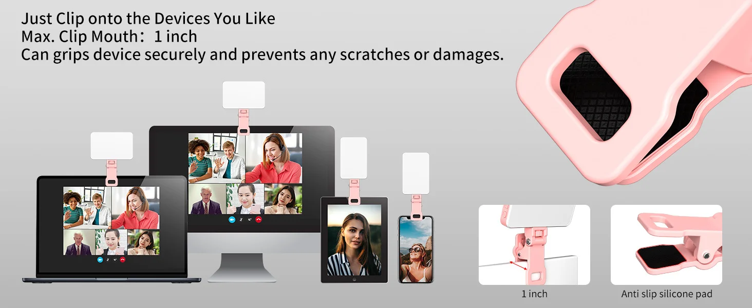 【Diseño de instalación de dos tipos】Incluye dos soportes: un clip de luz para teléfono con inclinación ajustable, que se coloca en su teléfono móvil, computadora portátil, iPad, tableta, espejo o mesita de noche.La apertura del clip está diseñada con silicona para evitar rayones y caídas.El clip del teléfono también se puede girar 360° para ajustar la dirección y el ángulo de la luz para selfies.Un adaptador integrado con rosca de 1/4” para cámaras, trípodes, palos para selfies, soporte de luz, etc., lo hace ideal para fotografía, grabación de vídeo o viajes.