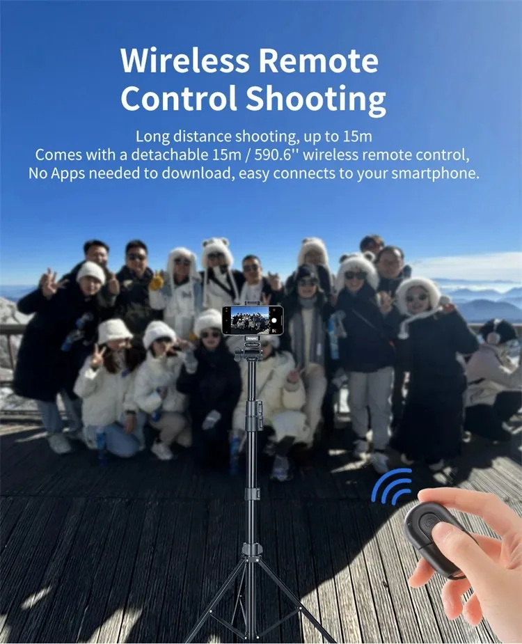Nuestro producto incluye un control remoto Bluetooth.El control remoto inalámbrico tiene un alcance de hasta 33 pies, que puede conectarse perfectamente a su teléfono inteligente, proporcionando una conexión confiable y estable.No te preocupes más por perder señal o experimentar retrasos.Funciona con todas las principales marcas de teléfonos inteligentes, lo que le brinda la libertad de capturar la toma perfecta desde la distancia.¡No más extensiones de brazos incómodas ni selfies apresurados!