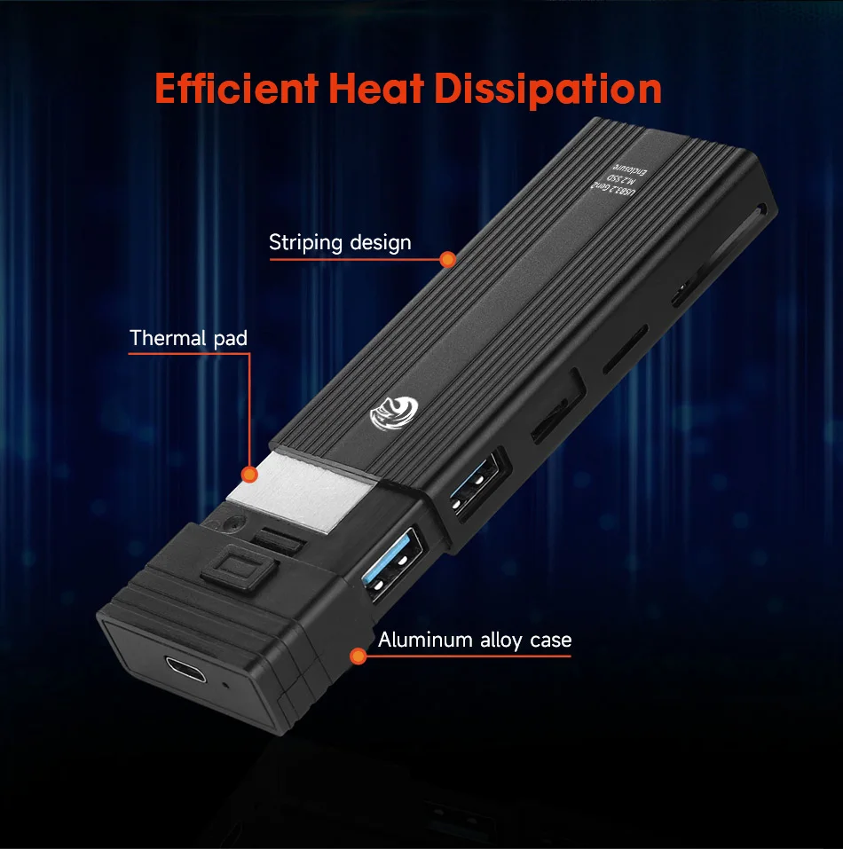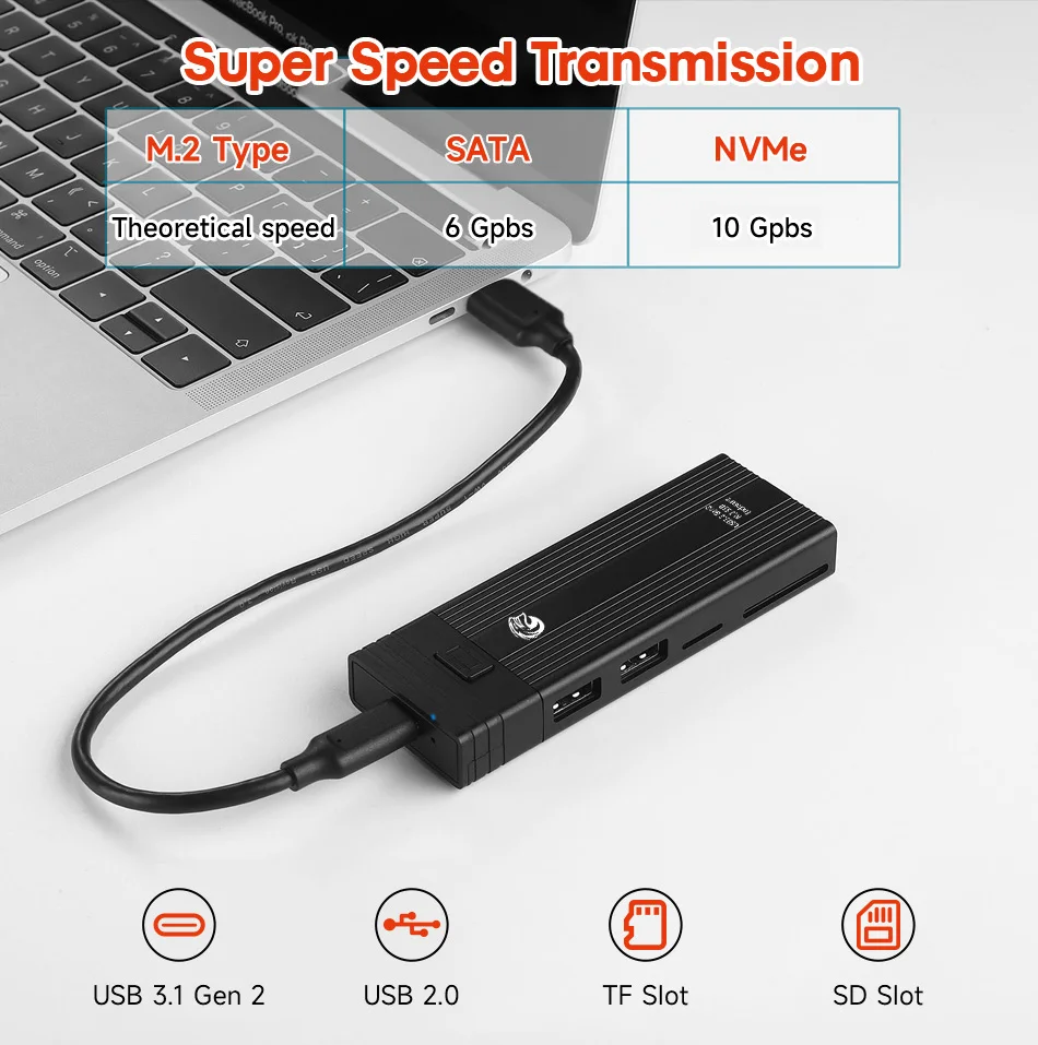 Material: aleación de aluminioInterfaz de soporte: tecla B + M/tecla MRanura de soporte: USB2.0 * 2, ranura para tarjeta SD * 1, ranura para tarjeta TF * 1 Conector de salida: tipo C a A o tipo C a C