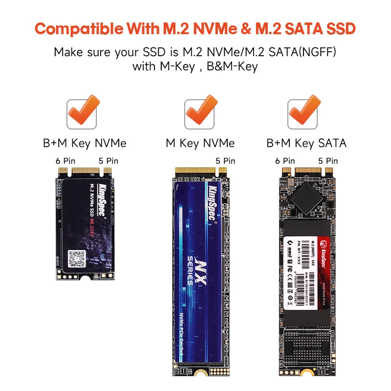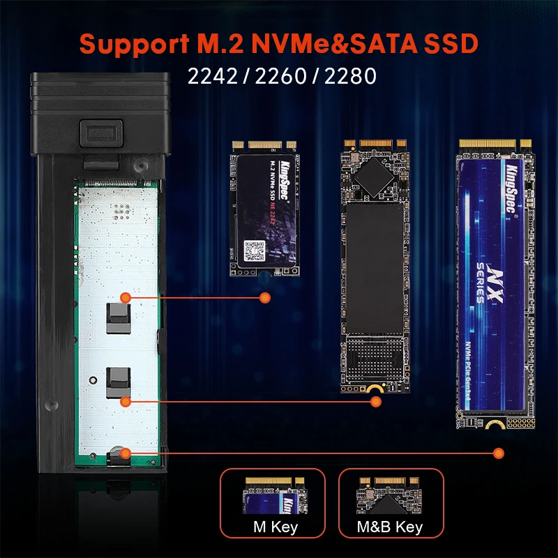 Descripción: Modelo de 10Gbps de protocolo dual.Compatible con NVME PCIe M Key/M + B Key SSD y NGFF SATA protocolo M + B Key SSDCaracterística:1. Carcasa de disco duro M.2 SATA NVME a USB 3,1.2. Cumple con las especificaciones SATA 3 y cumple con las especificaciones USB3.0.3. Compatible con el protocolo SATA NVME, adecuado para M2 (B + M Key/M Key) SSD.4. Admite SSD M.2, 22*30mm, 22*42mm, 22*60mm, 22*80mm unidades de estado sólido (no están incluidos los discos duros SSD).5. La velocidad de salida depende del tipo de SSD que utilice, SATA (6Gbps), NVME (10Gbps).6. El protocolo dual utiliza dos tipos de cables, tipo C a tipo A (5Gbps) y tipo C a tipo C (10Gbps).7. La carcasa de aleación de aluminio, que facilita la disipación de calor del disco duro durante el trabajo y aumenta la vida útil del disco duro.8. Compatible con protocolo UASP.9. Fácil de usar, sin necesidad de conducir.Especificación:Material: aleación de aluminio