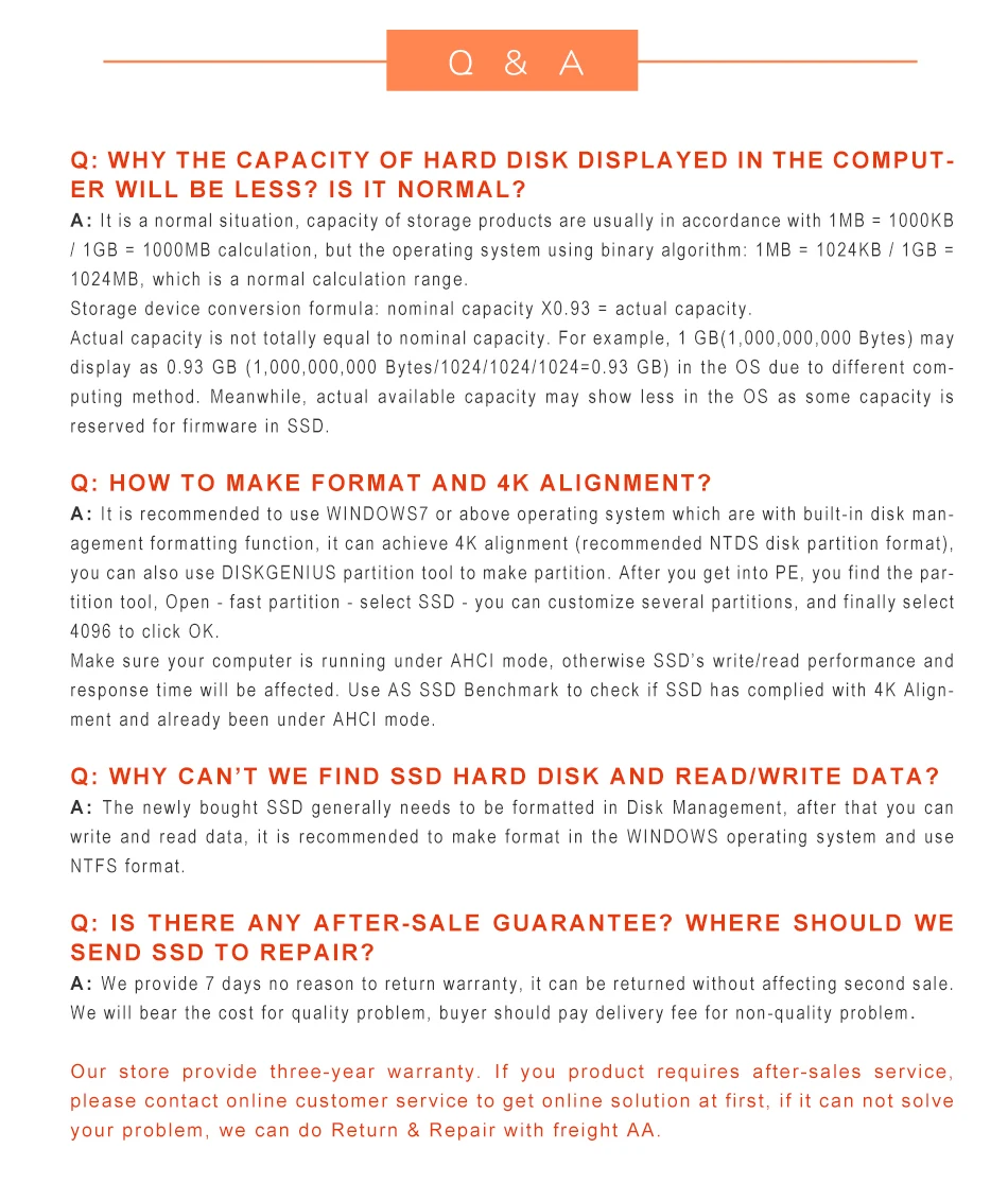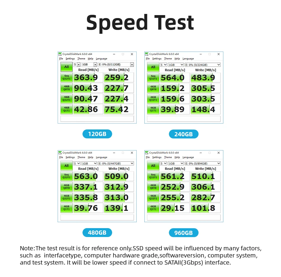 3) Para la velocidad, la prueba de velocidad mostrada es solo para referencia, la velocidad del SSD se verá influenciada por muchos factores, como el tipo de interfaz, el grado de hardware del ordenador, la versión del software, el sistema informático, y sistema de prueba. La velocidad será más baja de lo que debería ser si se conecta con la interfaz SATA II (3 Gb/s). (Estándar de prueba: ranura SATAIII (6 Gb/s), SSD vacío, Microsoft Windows 7/8/10/XP, CrystalDisk Mark 6,0*64 y etc.)
