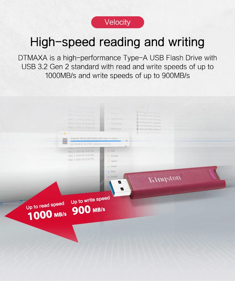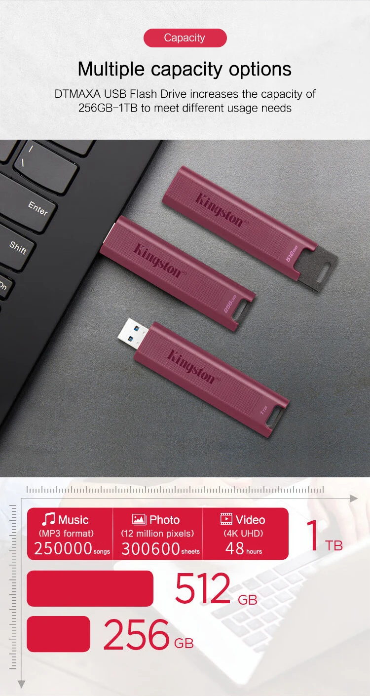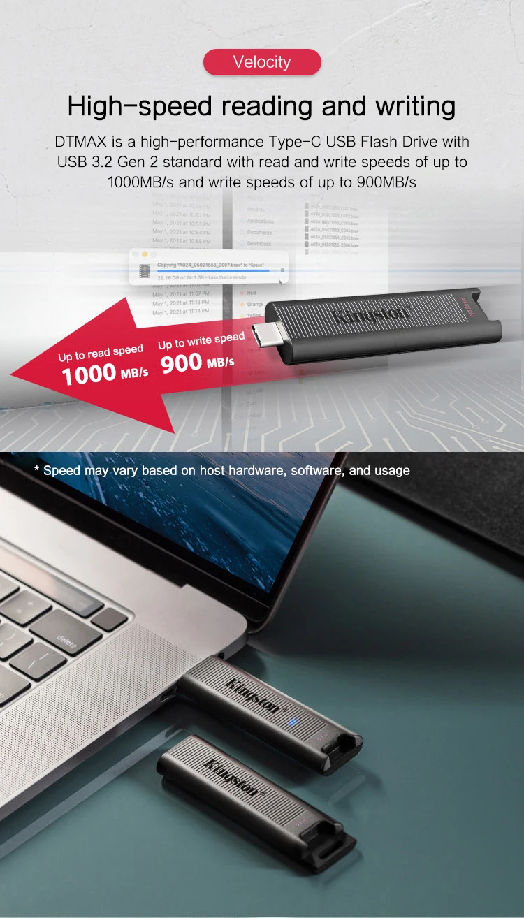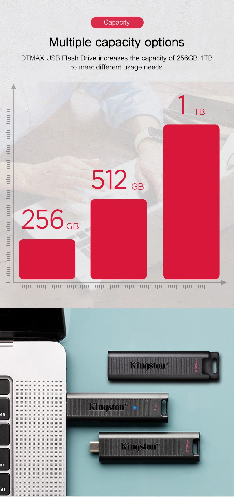 Las unidades flash USB de la serie DataTraveler Max de Kingston aprovechan el último estándar USB 3.2 Gen 2 para ofrecer velocidades de lectura/escritura innovadoras de hasta 1.000/900 MB/s.Diseñada pensando en la portabilidad y la comodidad, la exclusiva carcasa estriada protege el conector cuando no está en uso y se mueve fácilmente con un solo movimiento.Disponible en conexiones USB tipo C y tipo A para admitir computadoras portátiles y de escritorio tradicionales y de última generación.La serie DT Max ofrece un rendimiento superior y capacidades ampliadas de hasta 1 TB3, lo que las convierte en la solución ideal para transferir y almacenar archivos digitales grandes como fotografías HD, videos 4K/8K, música y más.