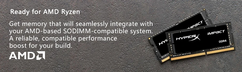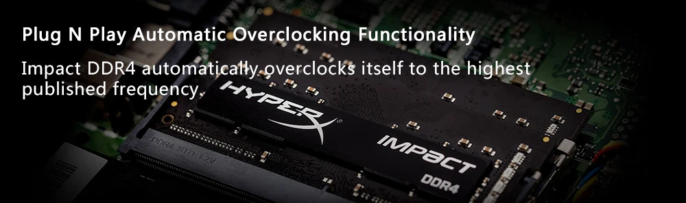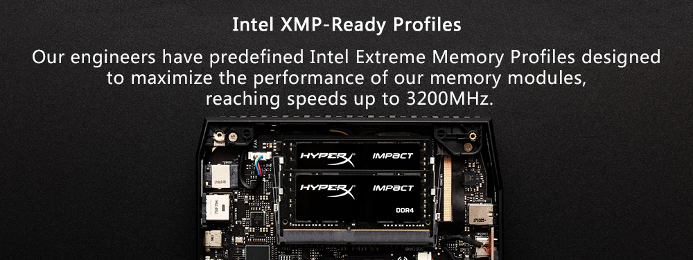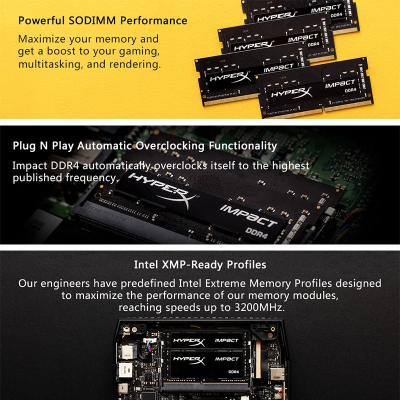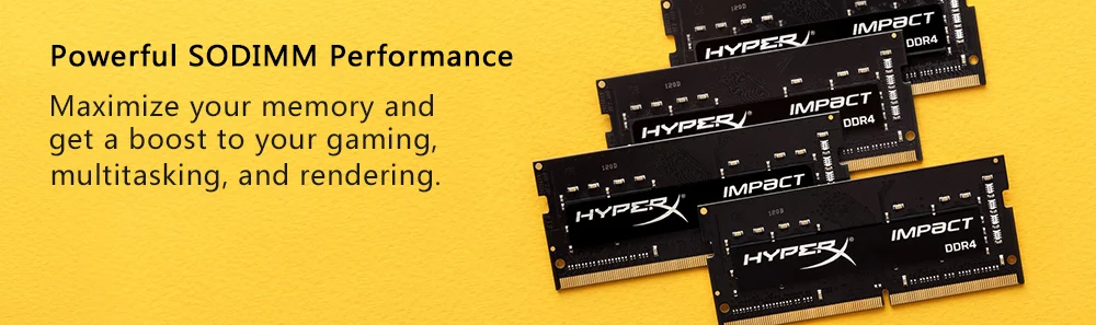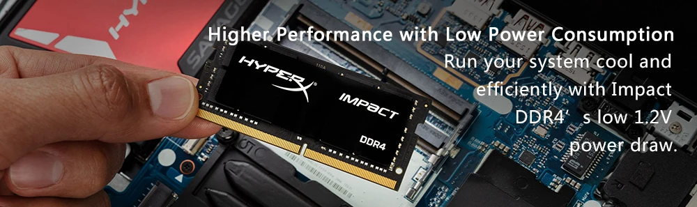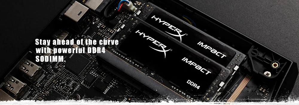 Consigue tu cuaderno o máquina de factor de forma pequeño totalmente equipada con HyperX®Impact DDR4 SODIMM y minimiza el retraso del sistema. Listo para AMD Ryzen e Intel XMP-ready en capacidades de hasta 64GB, Plug N Play HyperX Impact DDR4 overclocks automáticos a la frecuencia más alta publicada, hasta 3200MHz, para admitir las últimas tecnologías de CPU de Intel y AMD. Ranura en la elegante PCB negra para un impulso sin complicaciones, sin necesidad de jugar con la BIOS. Mejore el rendimiento de su sistema y siga funcionando fresco, silencioso y eficiente, gracias al bajo voltaje de 1,2 de HyperX Impact DDR4.