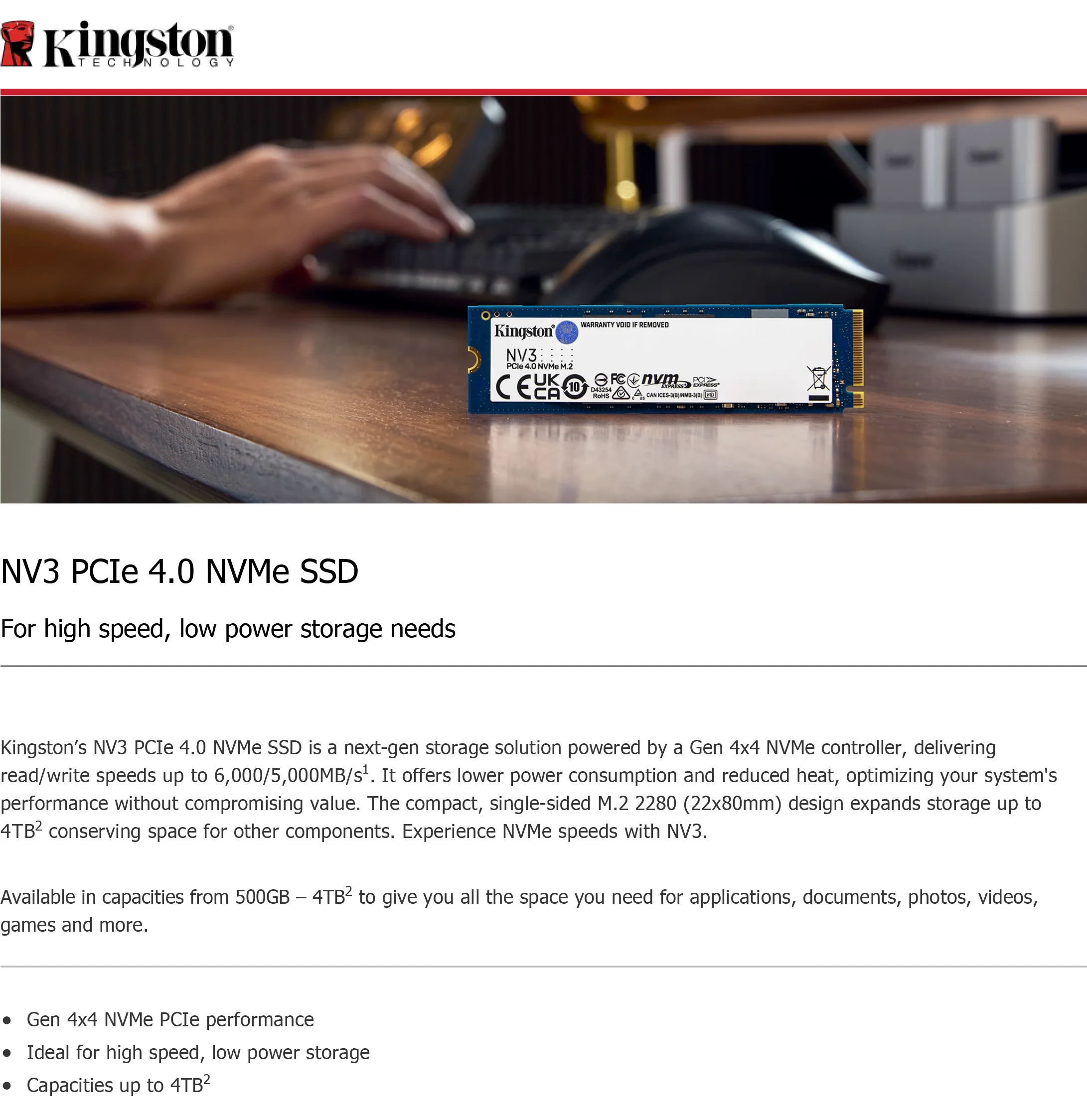 Comprar Kingston NV3 1TB M.2 2280 NVMe SSD 500GB 2TB PCIe 4.0 Gen 4x4 | Hasta 6000 MB/s