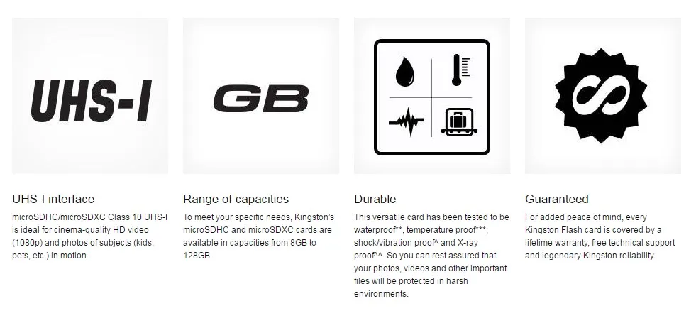 Diseñada para soportar entornos hostiles, esta versátil tarjeta se prueba a prueba de agua **, a prueba de temperatura ***, a prueba de golpes y vibraciones ^ y a prueba de rayos X ^. Las capacidades de 8 GB a 128 GB hacen que sea fácil encontrar la tarjeta adecuada para sus necesidades y proporcionar espacio para miles de fotos de alta resolución y horas de video ^^ ^.