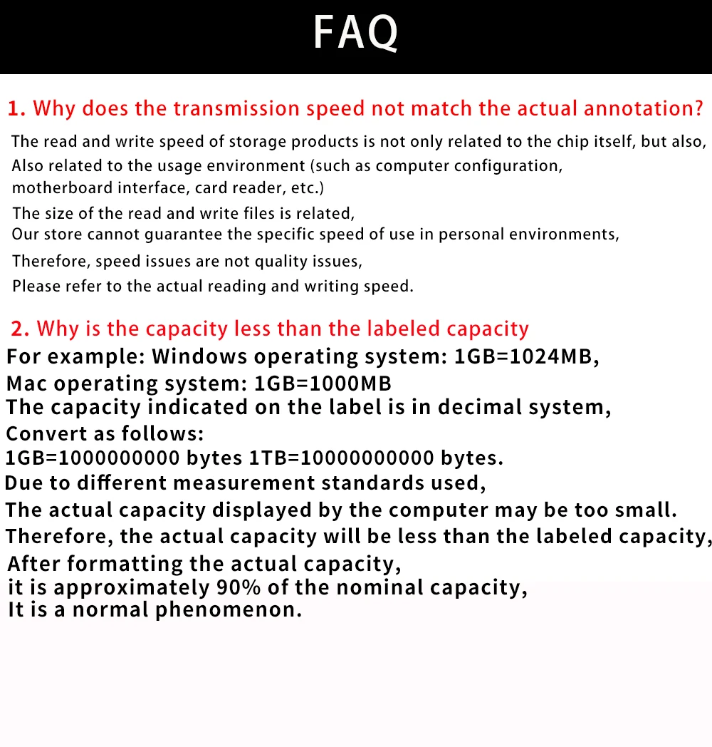 3. La velocidad de la tarjeta de memoria Micro SD se ve afectada en gran medida por el lector de tarjetas y la capacidad que elija, Puerto USB ECT. Dispositivo de baja calidad 100% ralentizará la velocidad de la tarjeta, 1MB=1000KB.