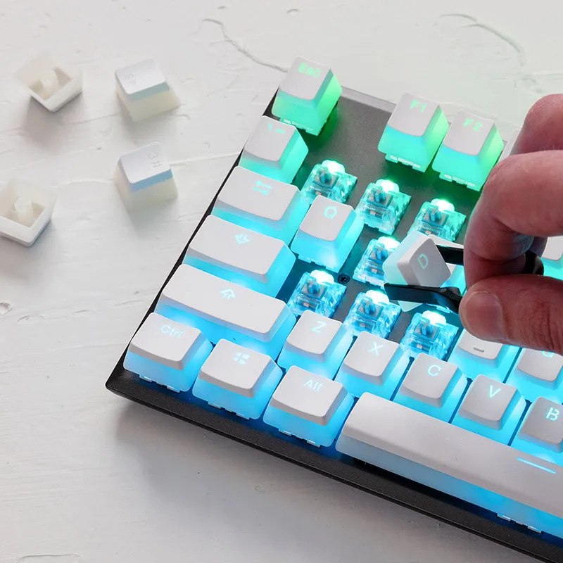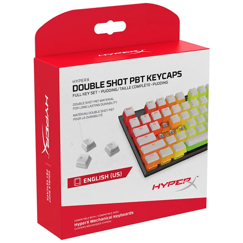HyperX™Las teclas PBT de doble disparo cuentan con un estilo de doble capa "pudín" translúcido diseñado para dejar escapar más luz para un brillo extra. Las teclas utilizan una construcción duradera de doble disparo para darles un estilo y fiabilidad sobresalientes. Las teclas PBT de doble disparo son compatibles con los teclados mecánicos HyperX para juegos y vienen con una herramienta de extracción de teclas HyperX.