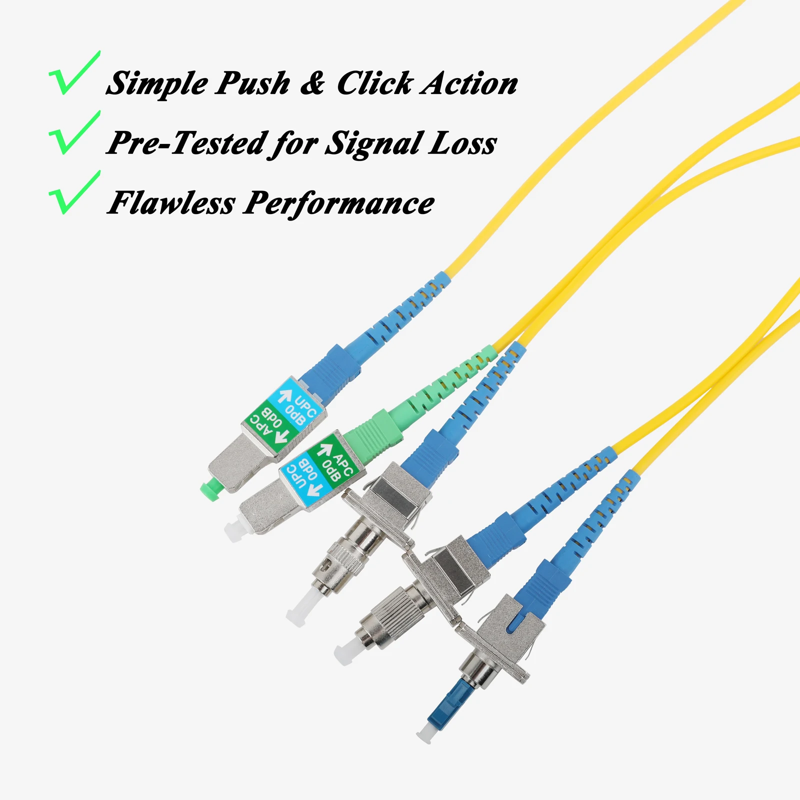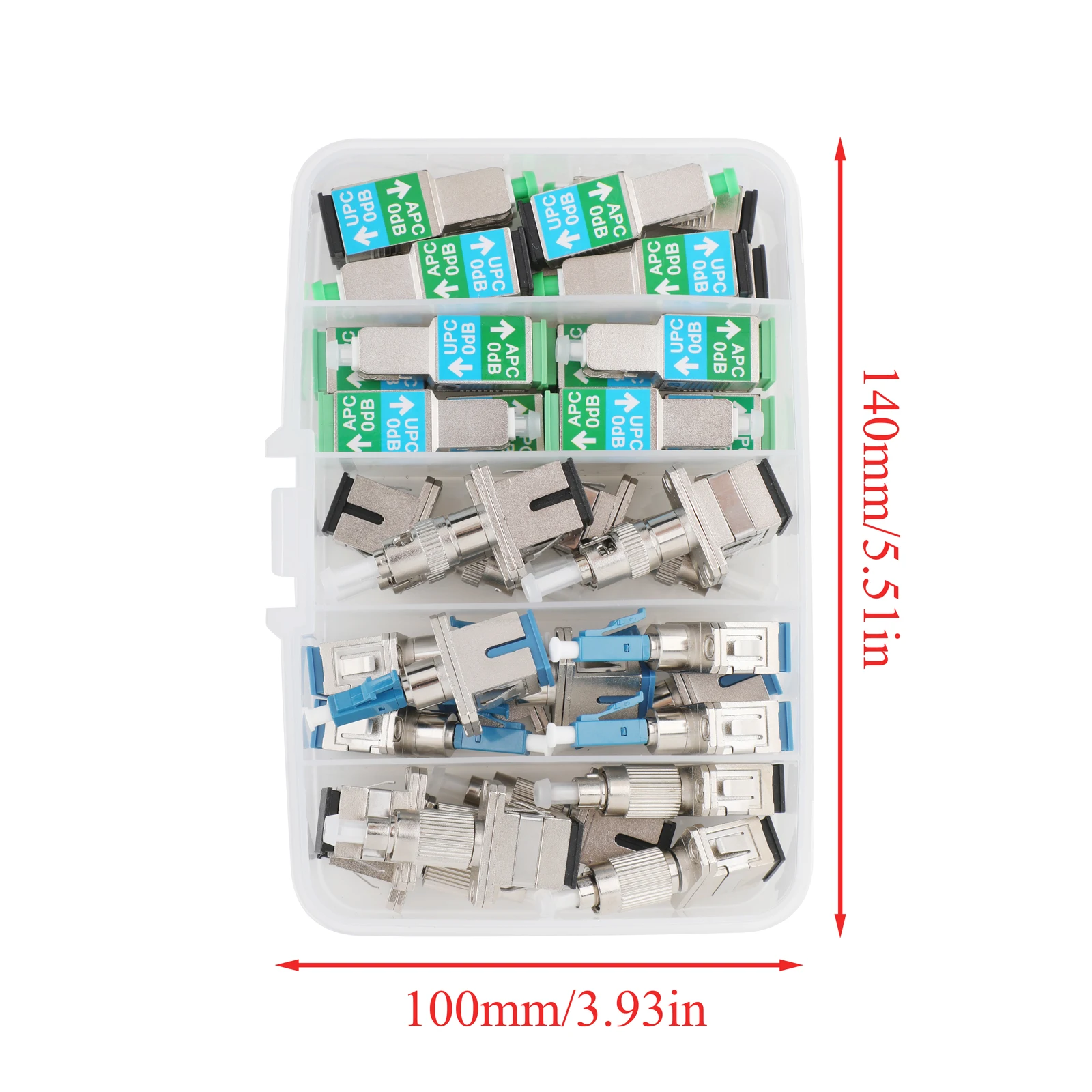 1.Contiene 5 adaptadores de fibra: incluye 6x FC/UPC macho a SC/UPC hembra, 8x LC/UPC macho a SC/UPC hembra, 6x ST/UPC macho a SC/UPC hembra, 8x SC/APC hembra a SC/UPC macho y 8 adaptadores de fibra óptica SC/APC macho a SC/UPC hembra en un organizador de estuche.