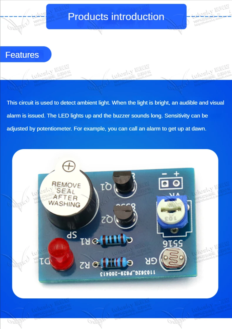 Comprar Kit de alarma de luz y sonido controlado sensible a la luz, práctica de electricista hecha a mano, producción electrónica divertida de bricolaje, piezas sueltas